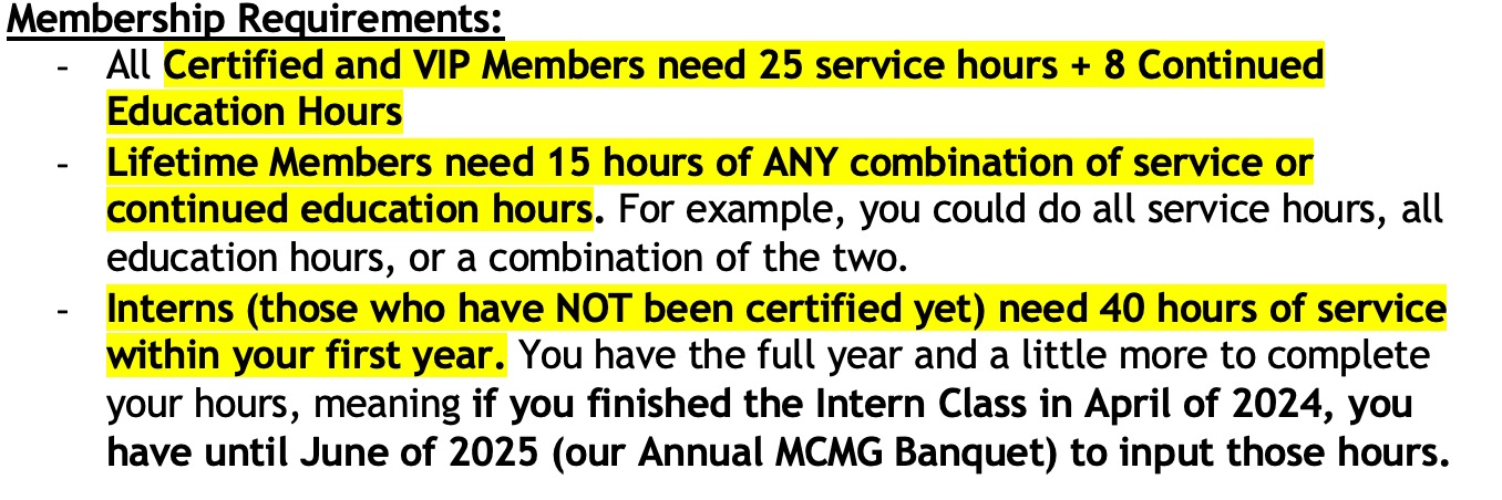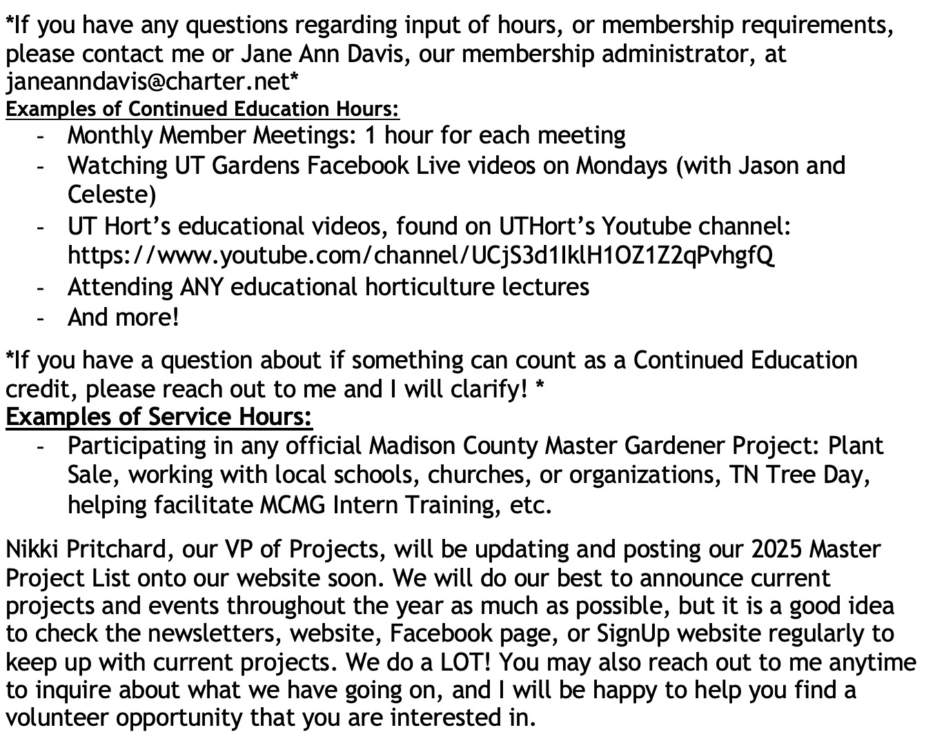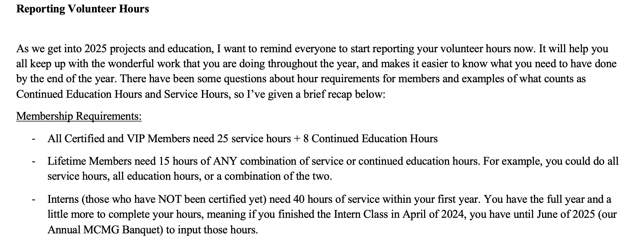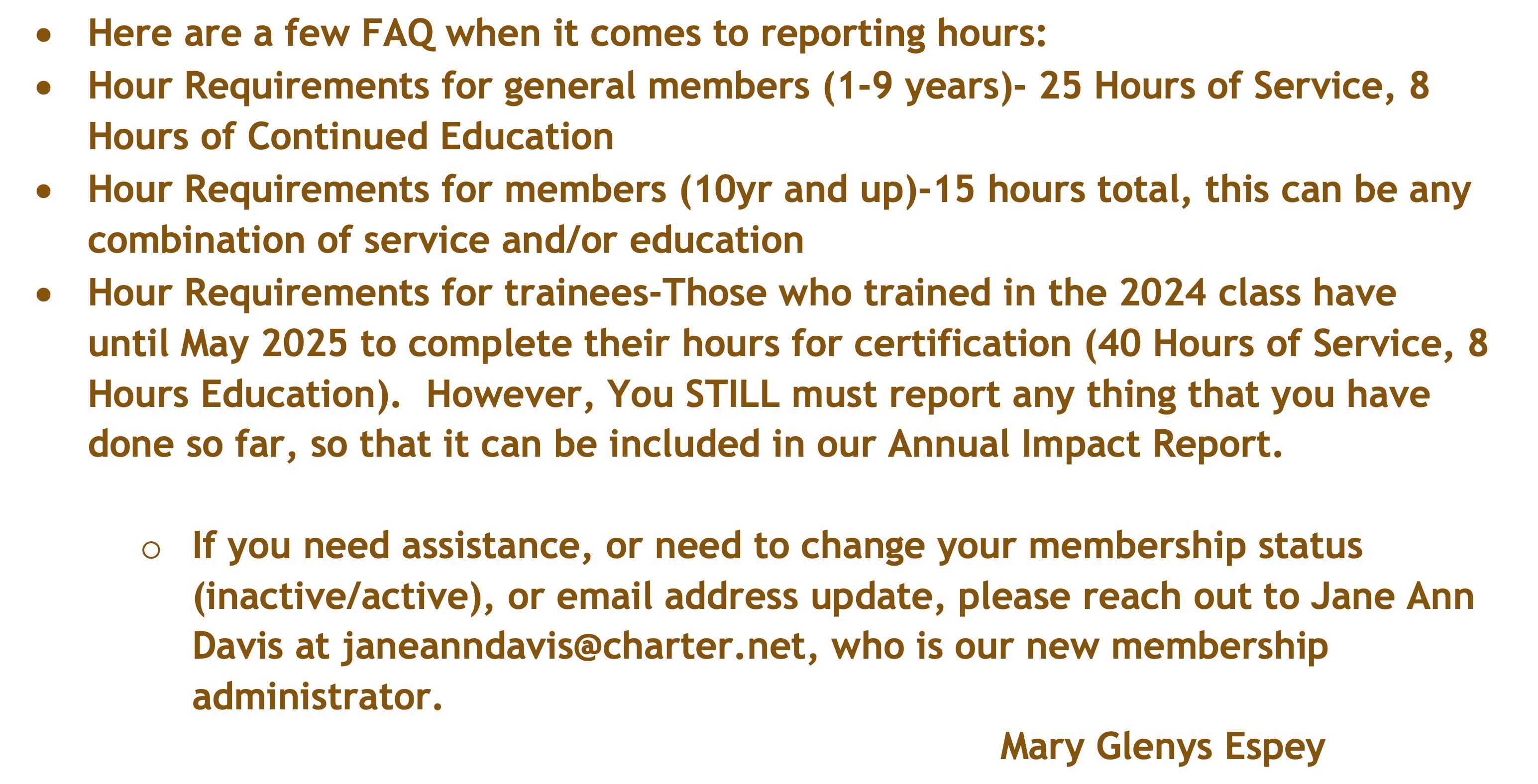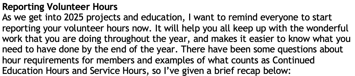 As we get into 2025 projects and education, I want to remind everyone to start reporting your volunteer hours now. It will help you all keep up with the excellent work you are doing throughout the year and make it easier to know what you need to have accomplished by the end of the year. There have been some questions about hour requirements for members and examples of what counts as Continued Education Hours and Service Hours, so I’ve given a brief recap below: