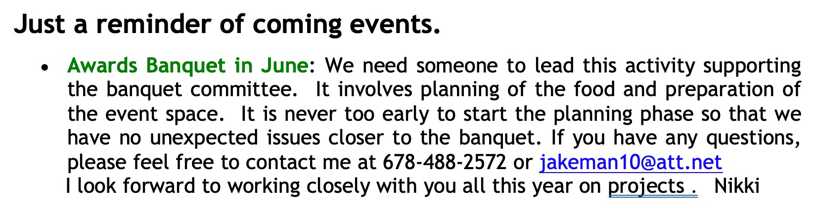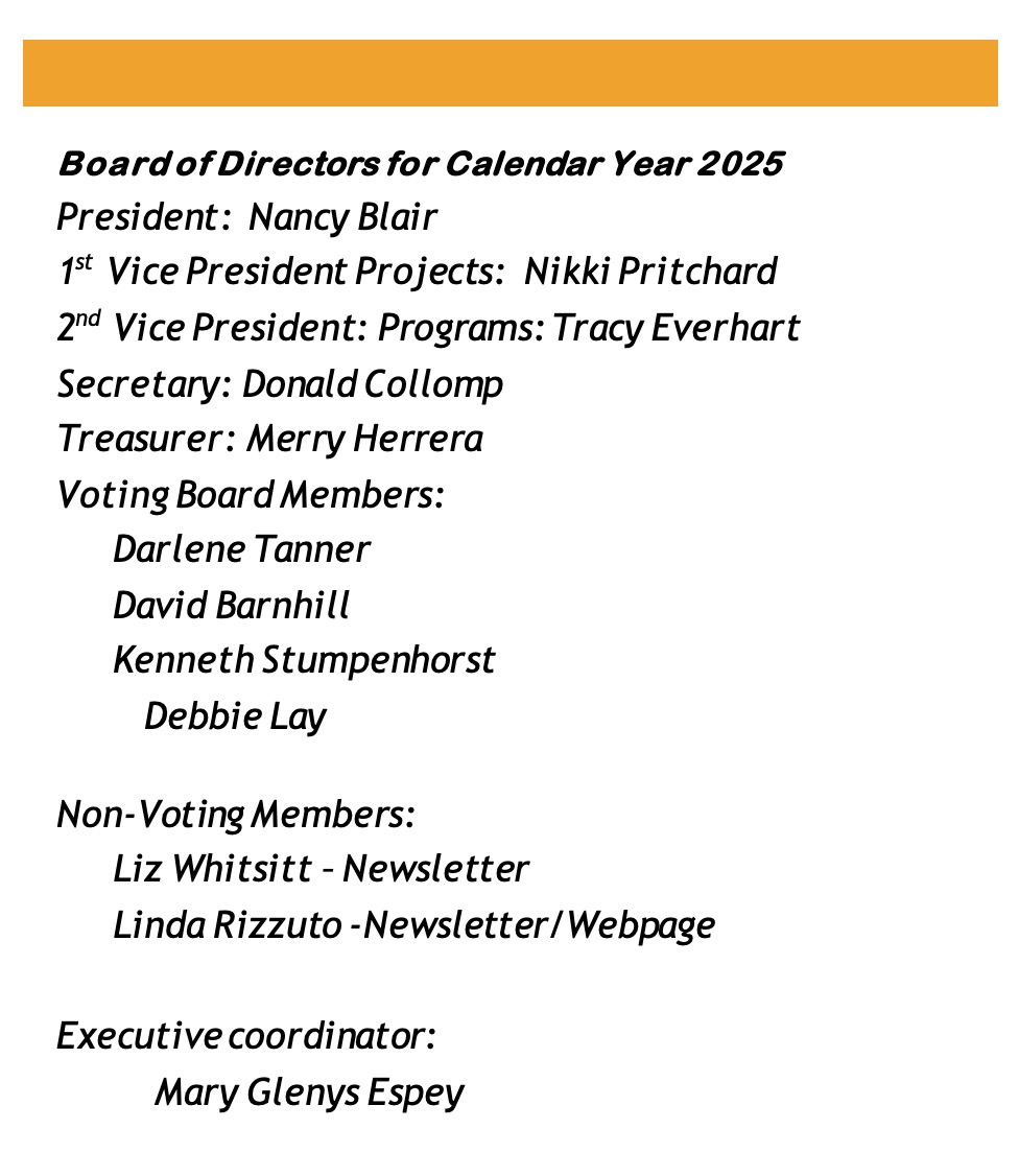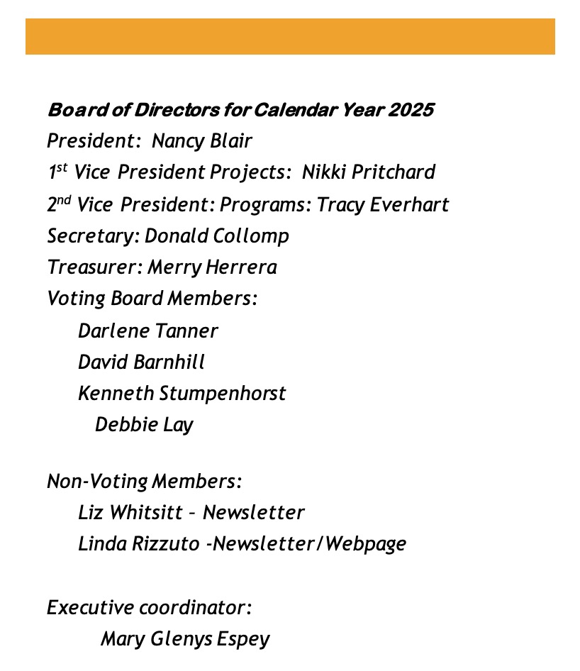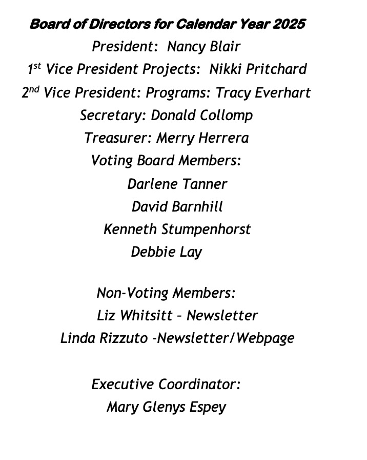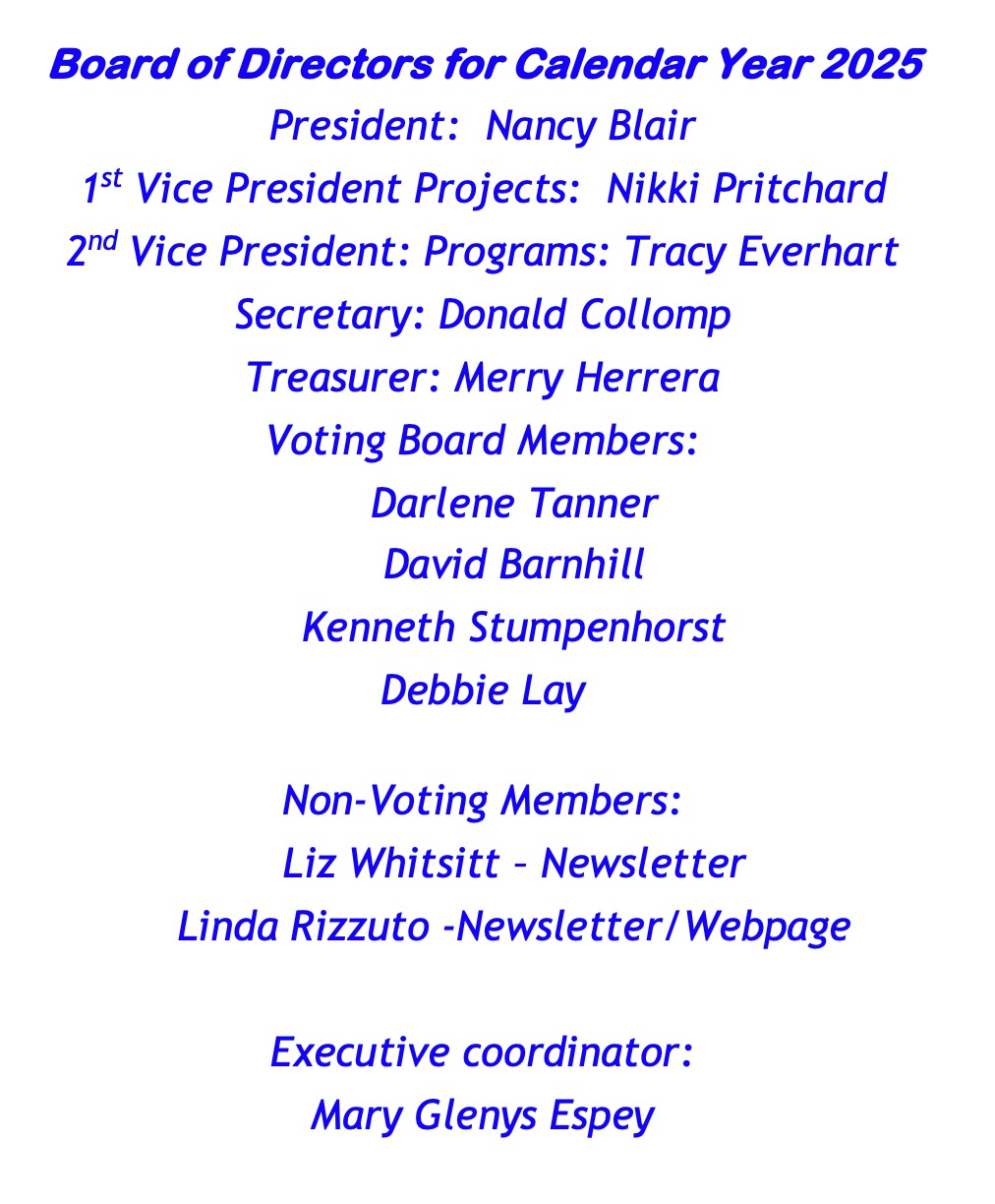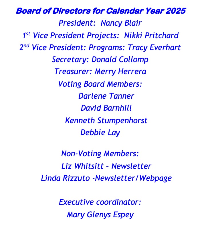 As we get into 2025 projects and education, I want to remind everyone to start reporting your volunteer hours now. It will help you all keep up with the excellent work you are doing throughout the year and make it easier to know what you need to have accomplished by the end of the year. There have been some questions about hour requirements for members and examples of what counts as Continued Education Hours and Service Hours, so I’ve given a brief recap below: