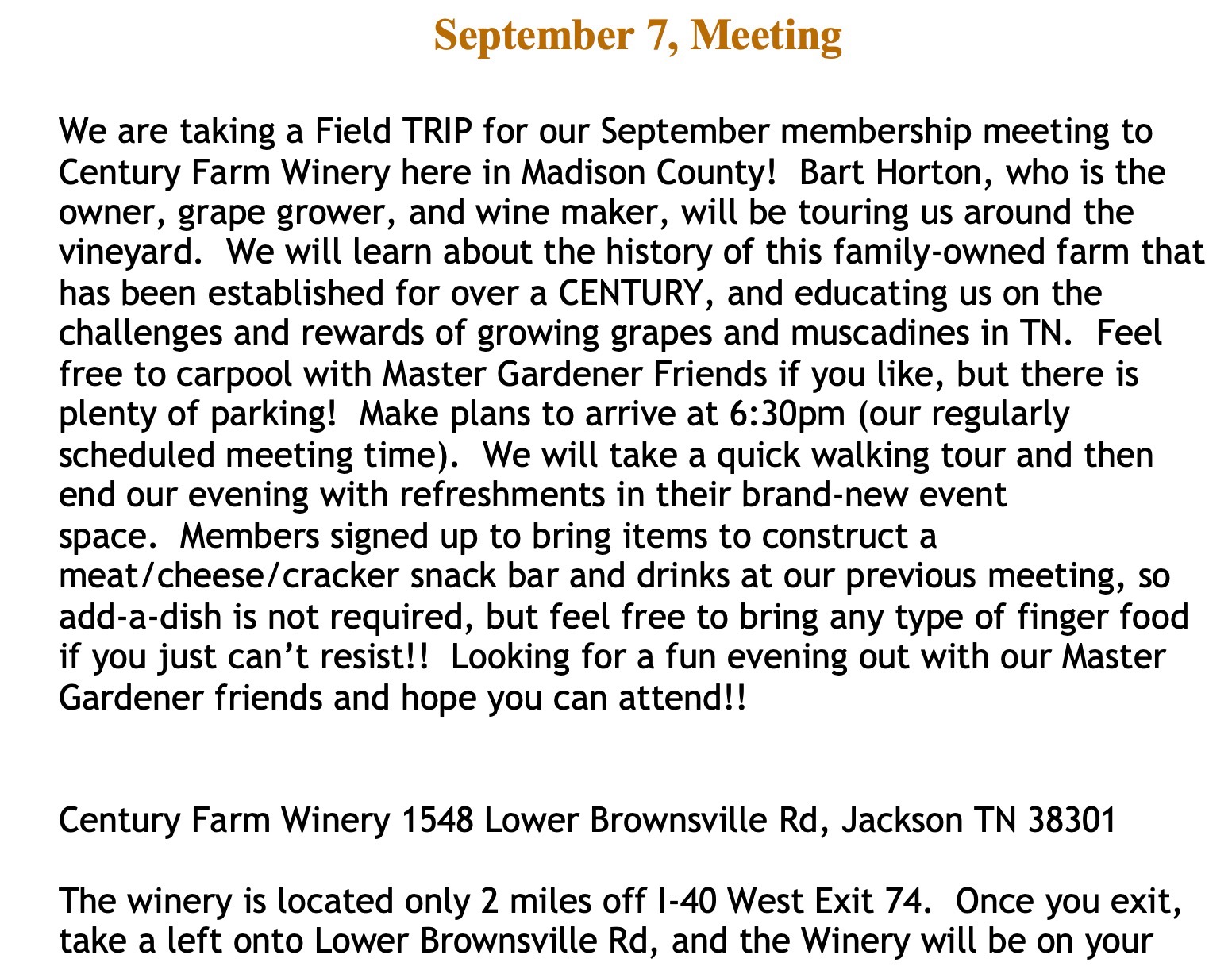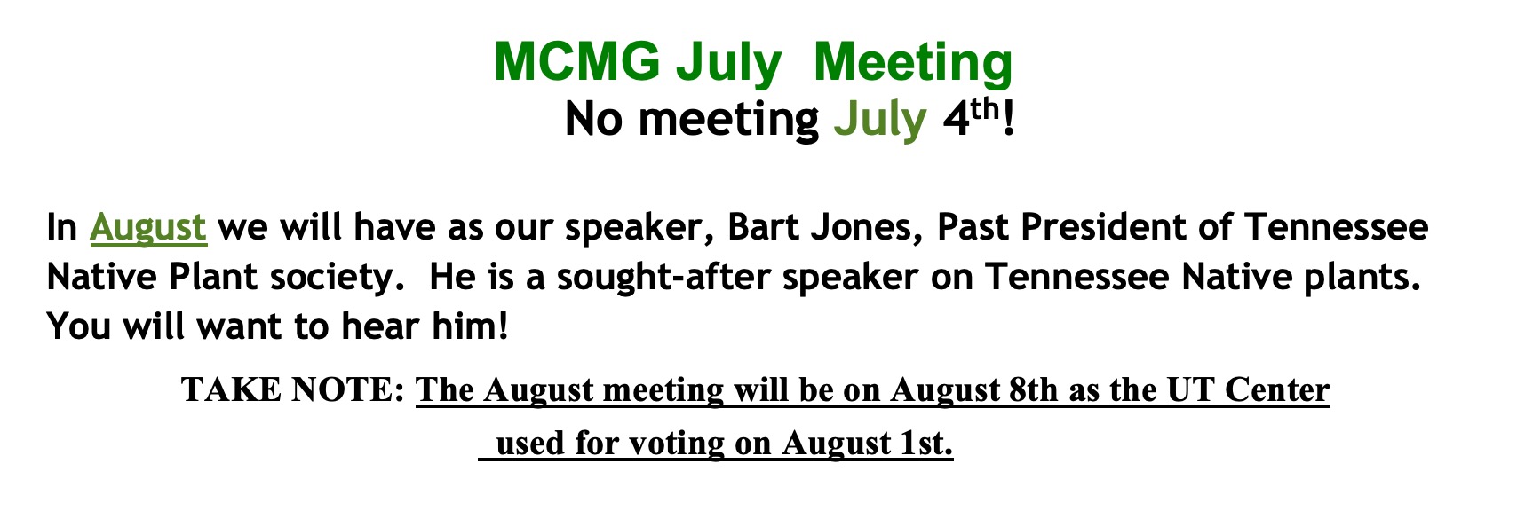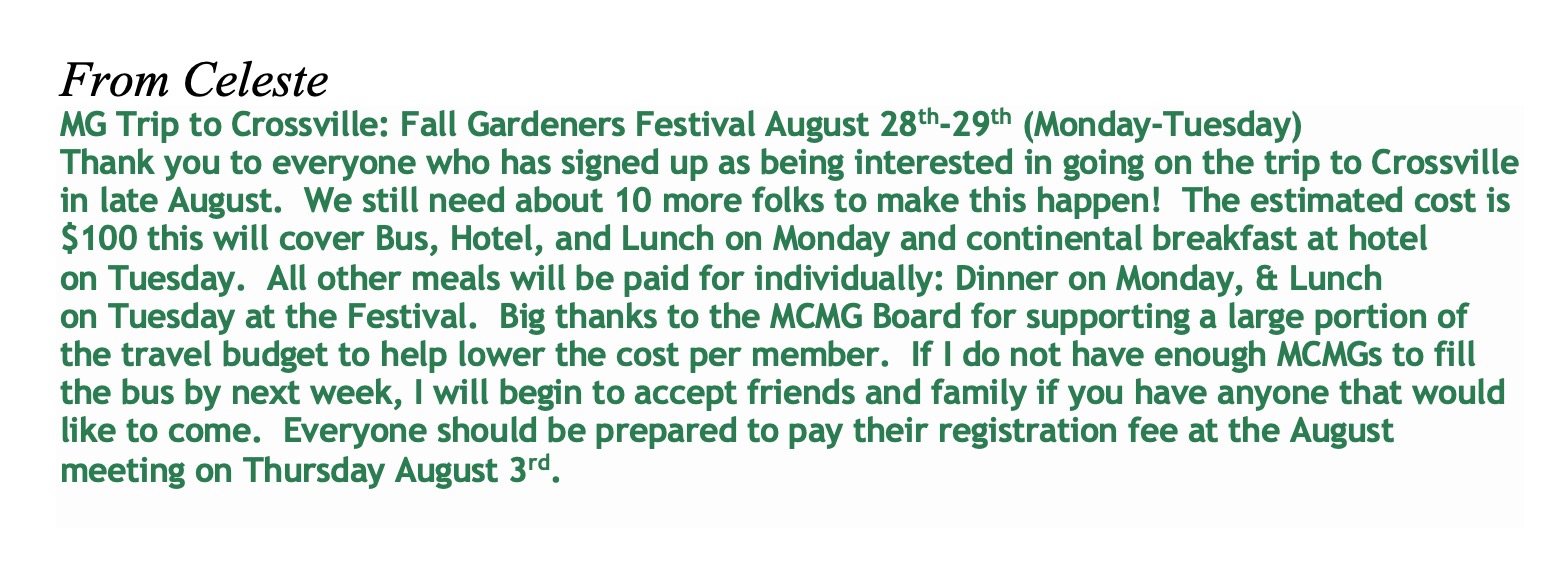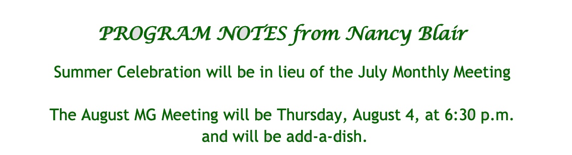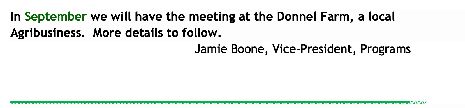 Fall is a great time for gardening! Some of you have begun planting a fall crop in your vegetable gardens, and others are collecting seed to use in the spring. It’s time to think about plants that will need extra care during the cold months of winter. There will be an opportunity to share some of those plants at the September meeting. If you have house plants you are ready to part with or some of your summer pots that you just don’t have room to overwinter, think about bringing them to the September meeting and share with others that might have room or enjoy caring for them during the winter months. We will have our traditional seed swap in November, so be collecting and labeling those seeds.