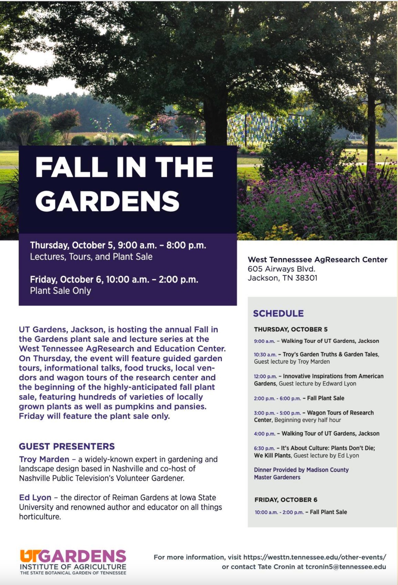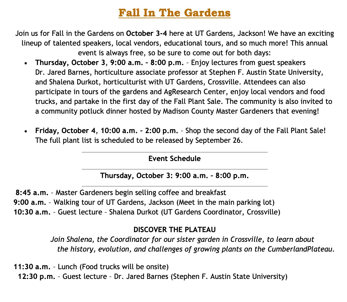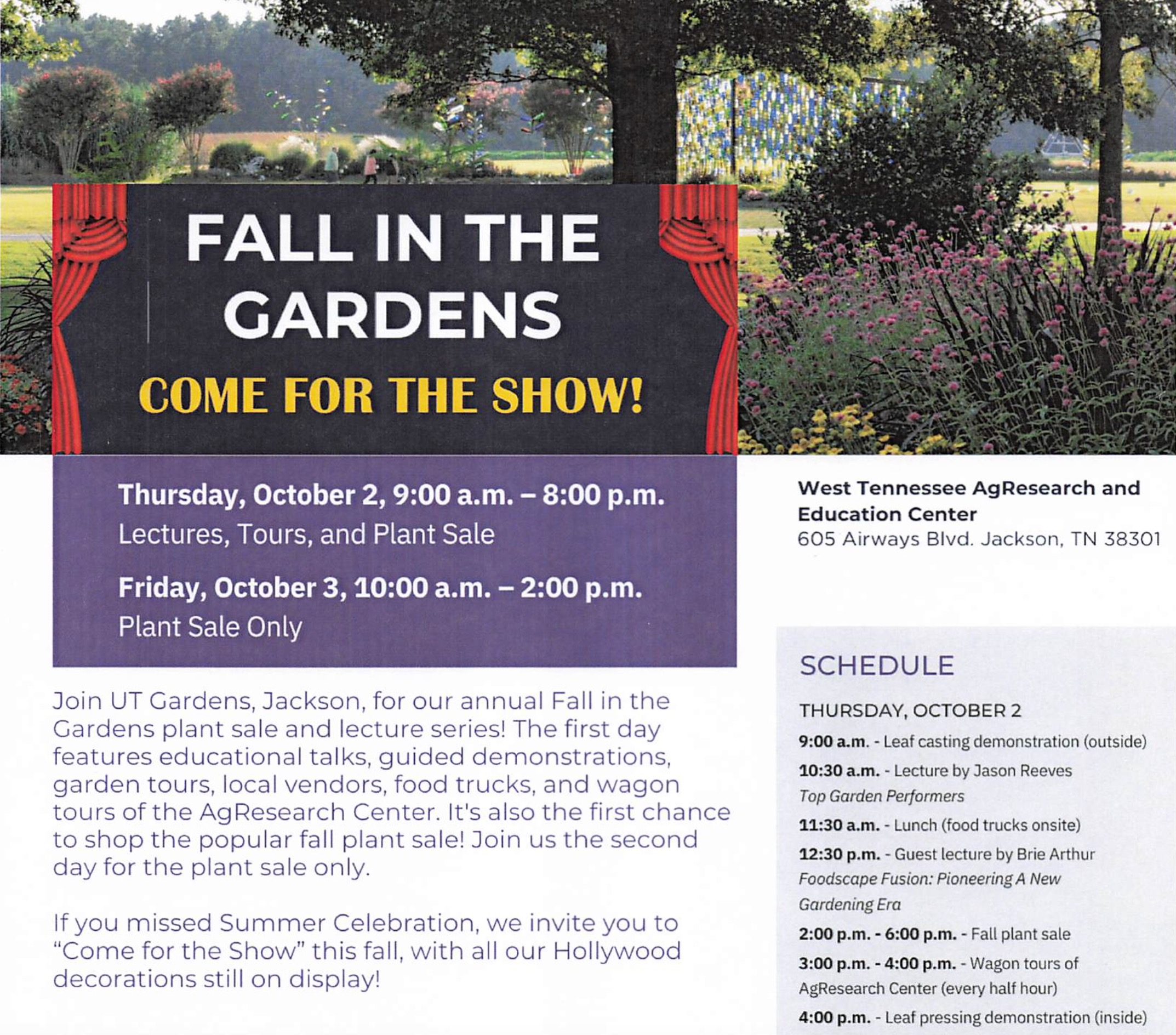 Fall in the Gardens is scheduled for October 2 from 9:00 a.m. to 8:00 p.m. and October 3 from 10:00 a.m. to 2:00 p.m. The complete program can be found here, with the plant list dropping a week before the event: