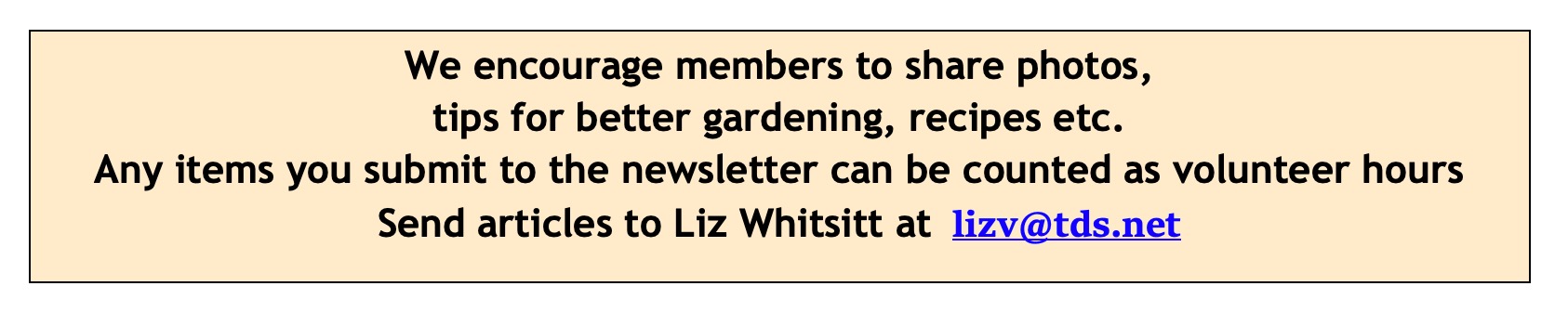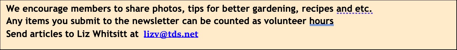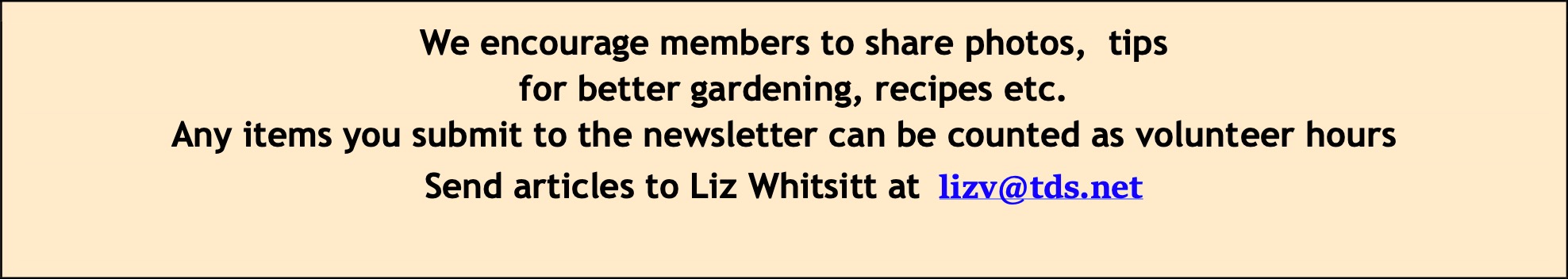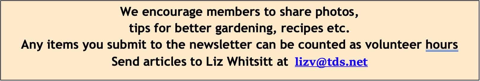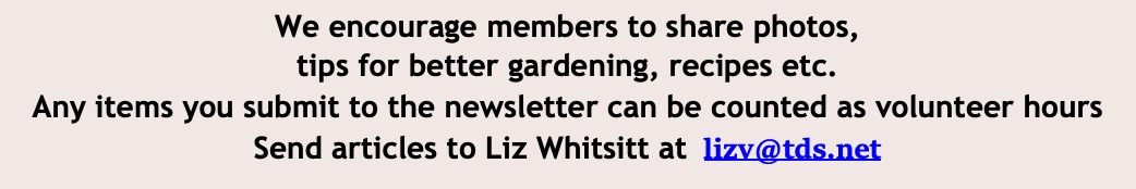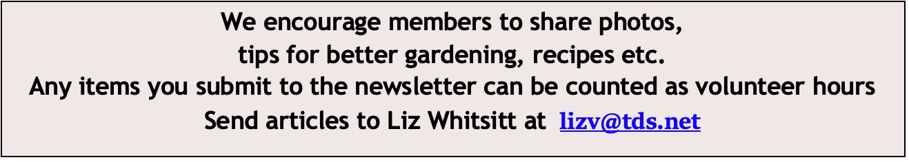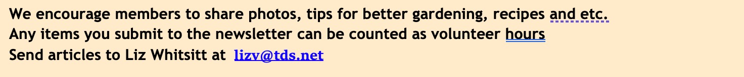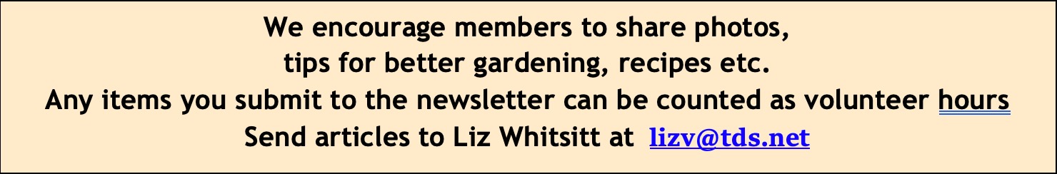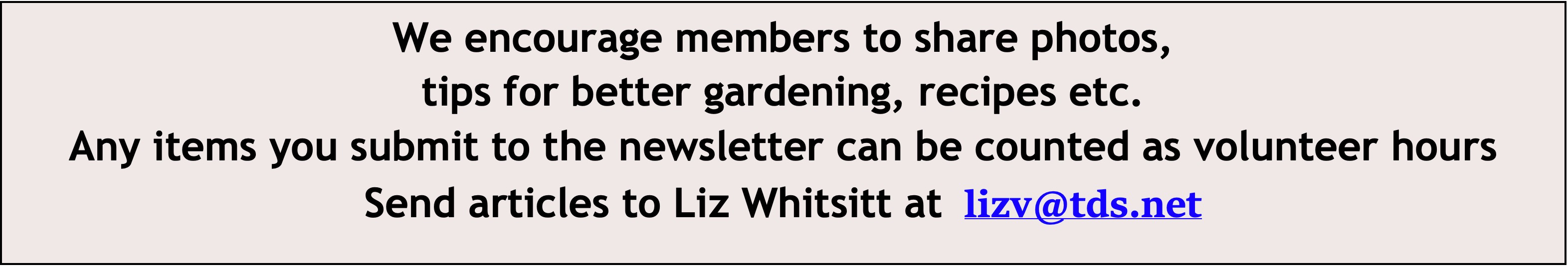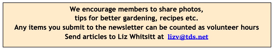 Our Board invites all of our members to share their gardening successes and product hit-or-miss experiences through the newsletter. I will explore more safety objectives in the future as I learn more to share with you. In the meantime - don’t rush, enjoy gardening and be safe.