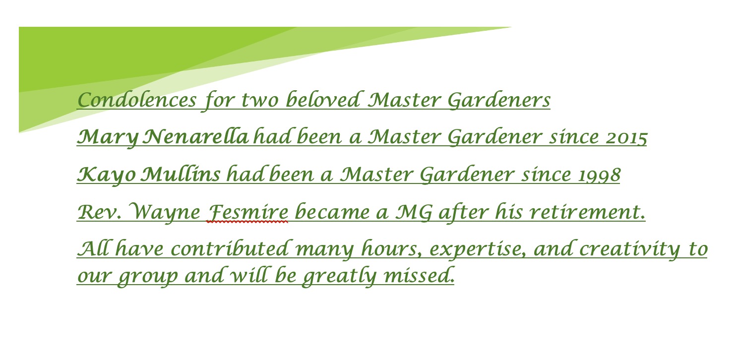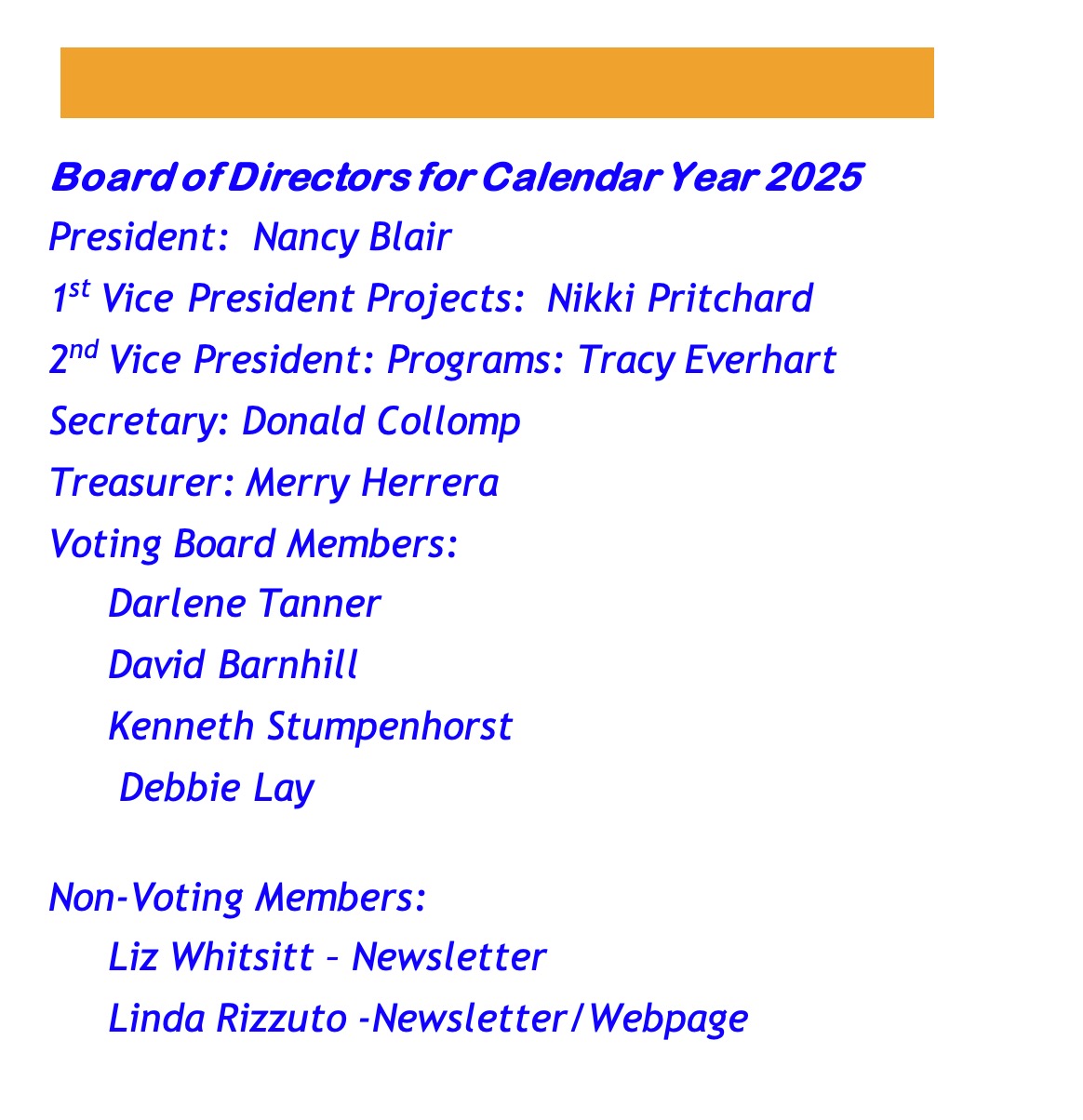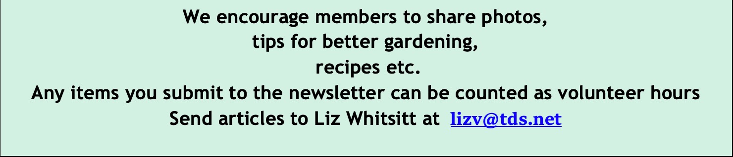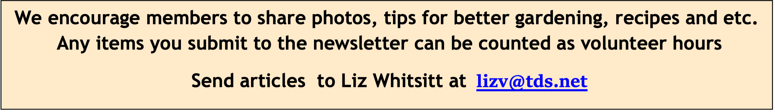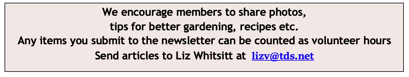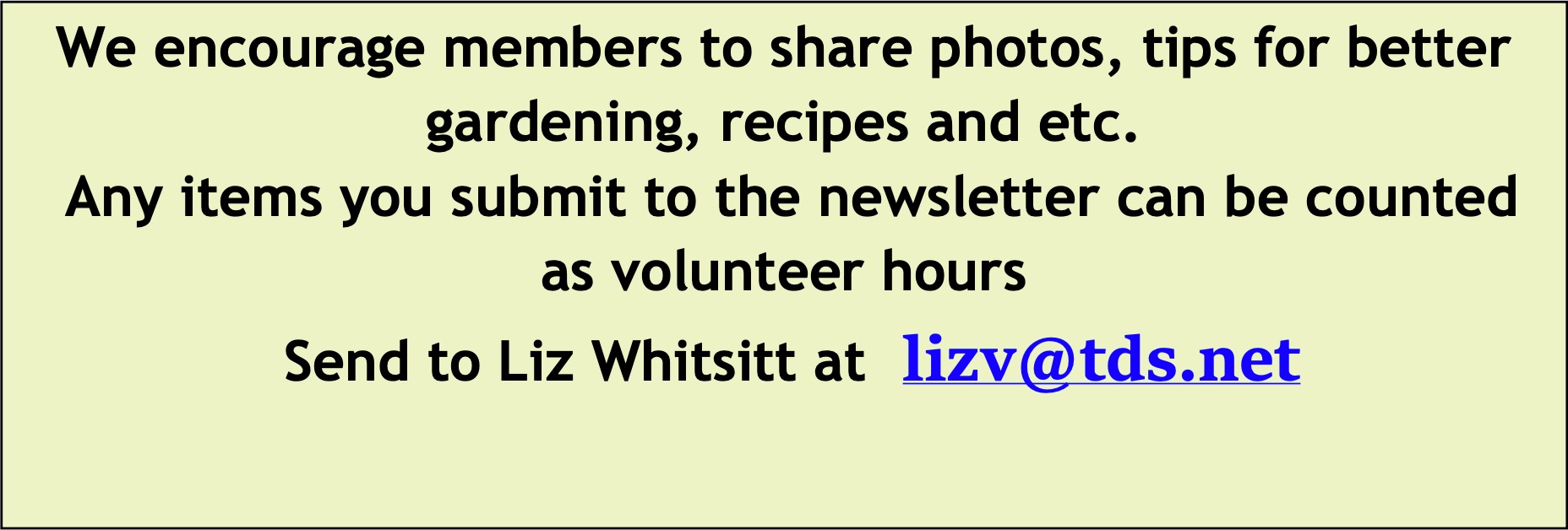 Our Board invites all of our members to share their gardening successes and product hit-or-miss experiences through the newsletter. I will explore more safety objectives in the future as I learn more to share with you. In the meantime - don’t rush, enjoy gardening and be safe.