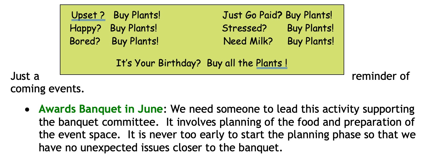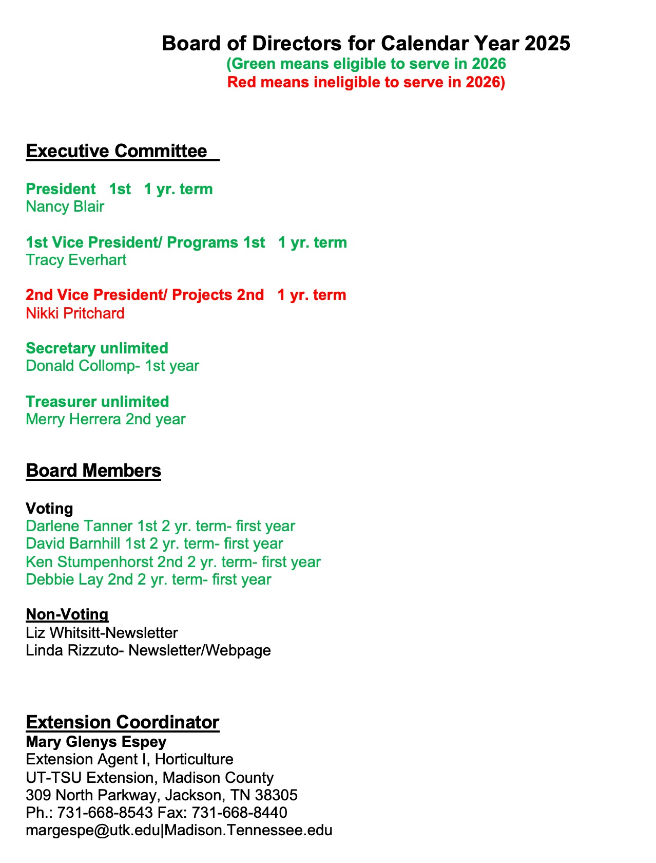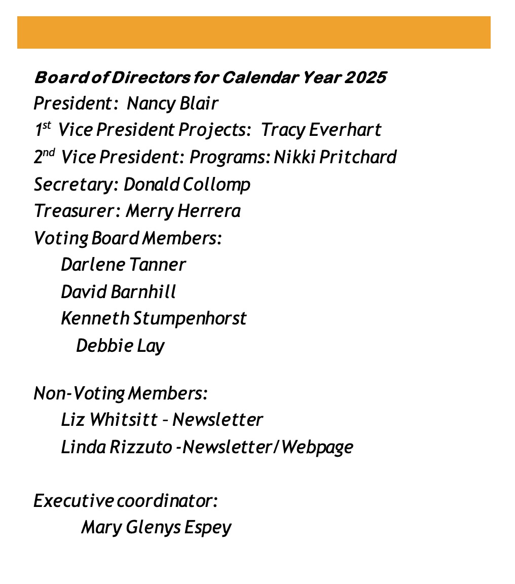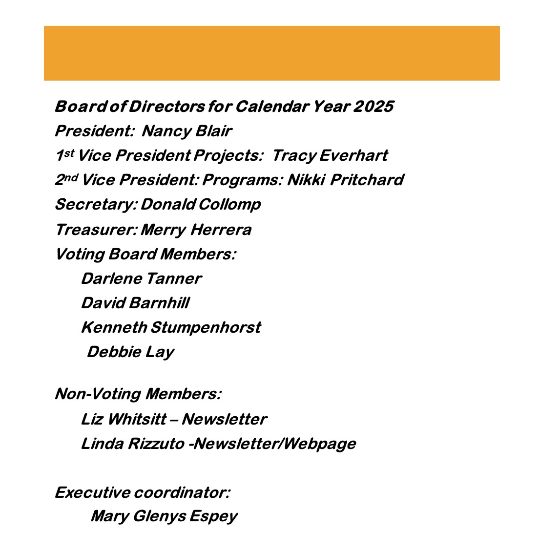 Our Board invites all of our members to share their gardening successes and product hit-or-miss experiences through the newsletter. I will explore more safety objectives in the future as I learn more to share with you. In the meantime - don’t rush, enjoy gardening and be safe.