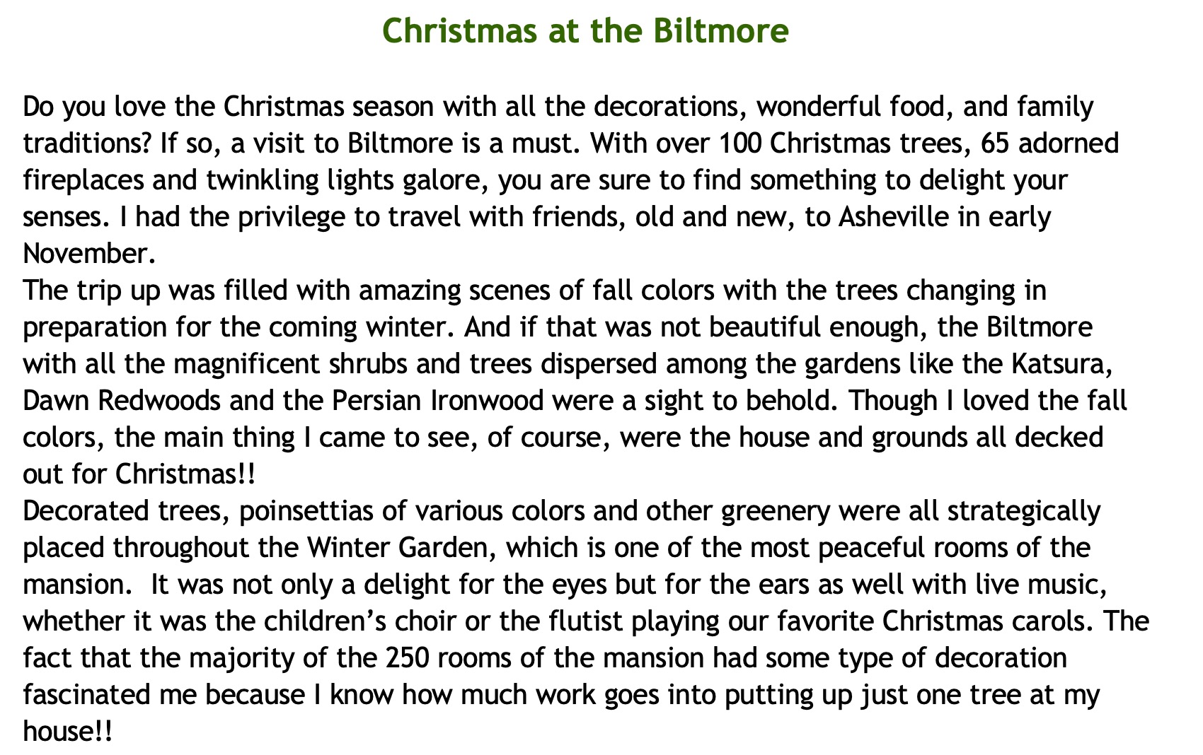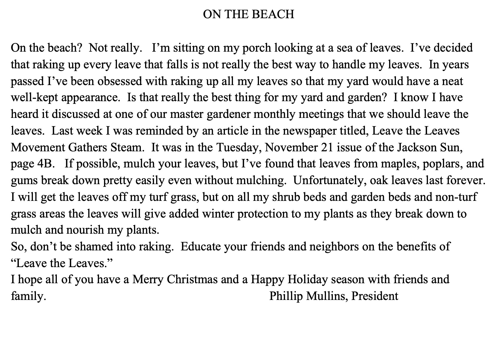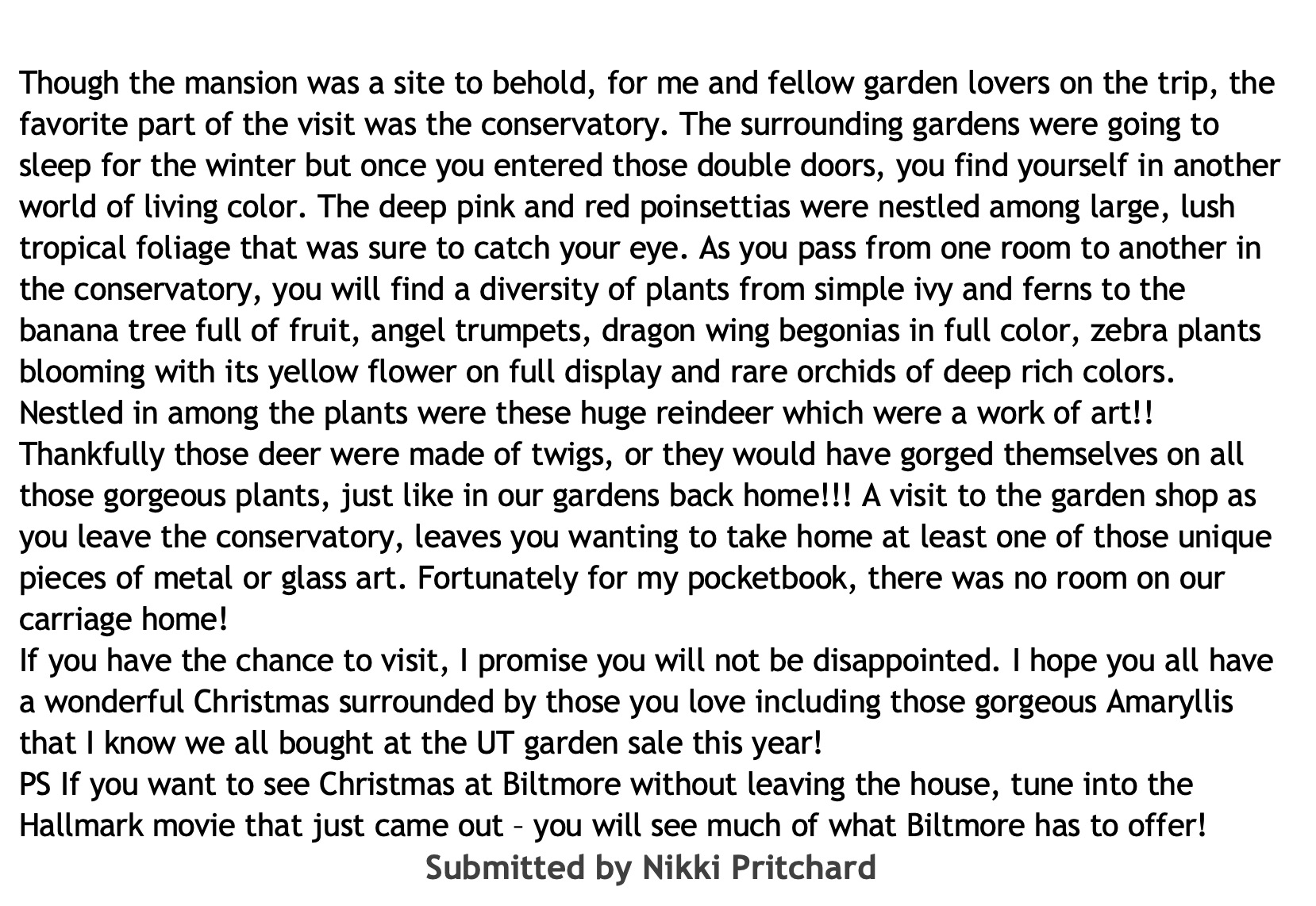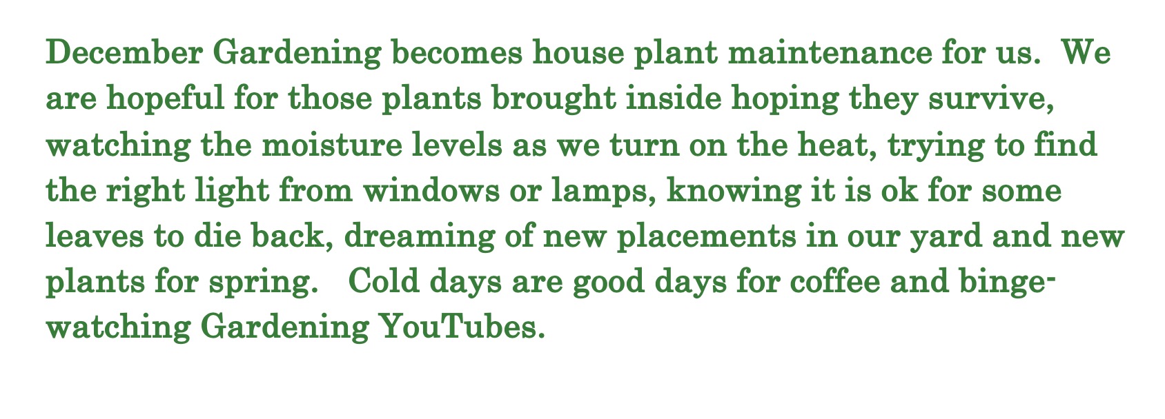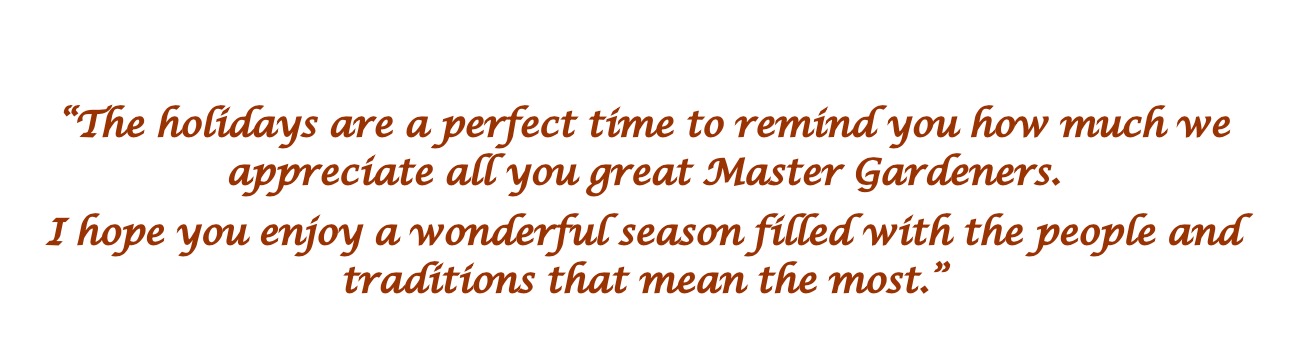 Nancy is ill this month - as are some others in our group. Please take extra precautions as needed (because cold, congestion, flu, and other respiratory illnesses are lurking about). We want everyone in our group to have happy, healthy holidays. So we are foregoing the usual President's message, but still preparing our hearts, lives and flower beds for the joy of the upcoming holidays! Happy Thanksgiving to Everyone.