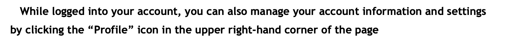 While logged into your account, you can also manage your account information and settings by clicking the “Profile” icon in the upper right-hand corner of the page