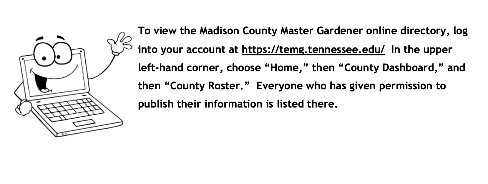https://temg.tennessee.edu/ In the upper left-hand corner, choose “Home,” then “County Dashboard,” and then “County Roster.” Everyone who has given permission to publish their information is listed here.
