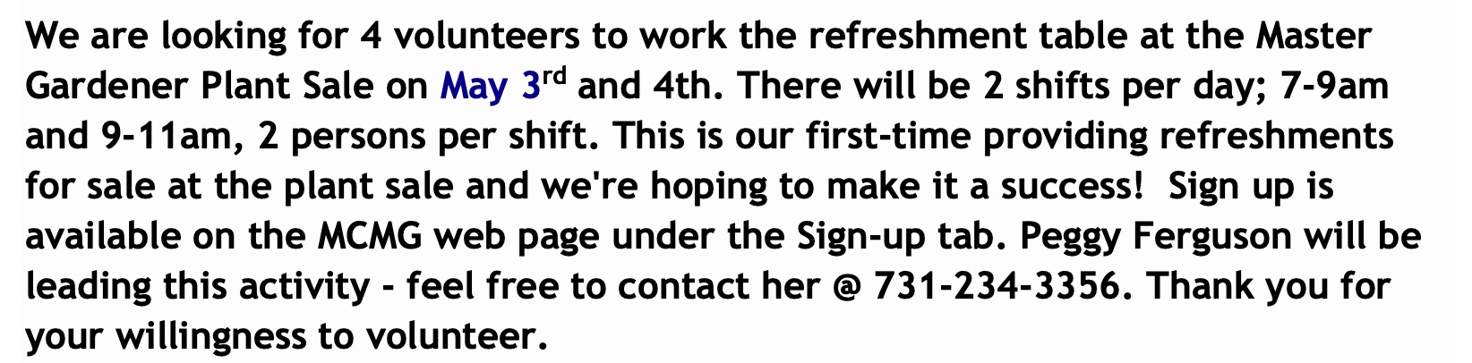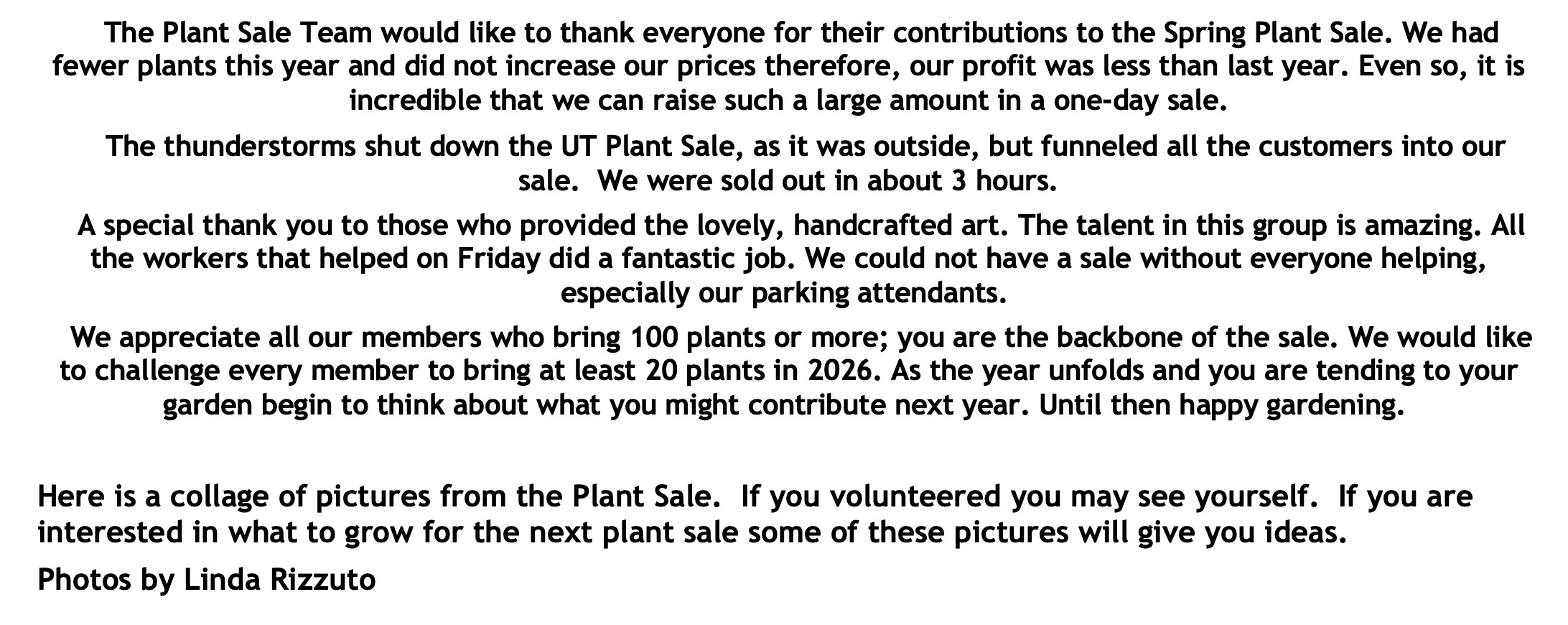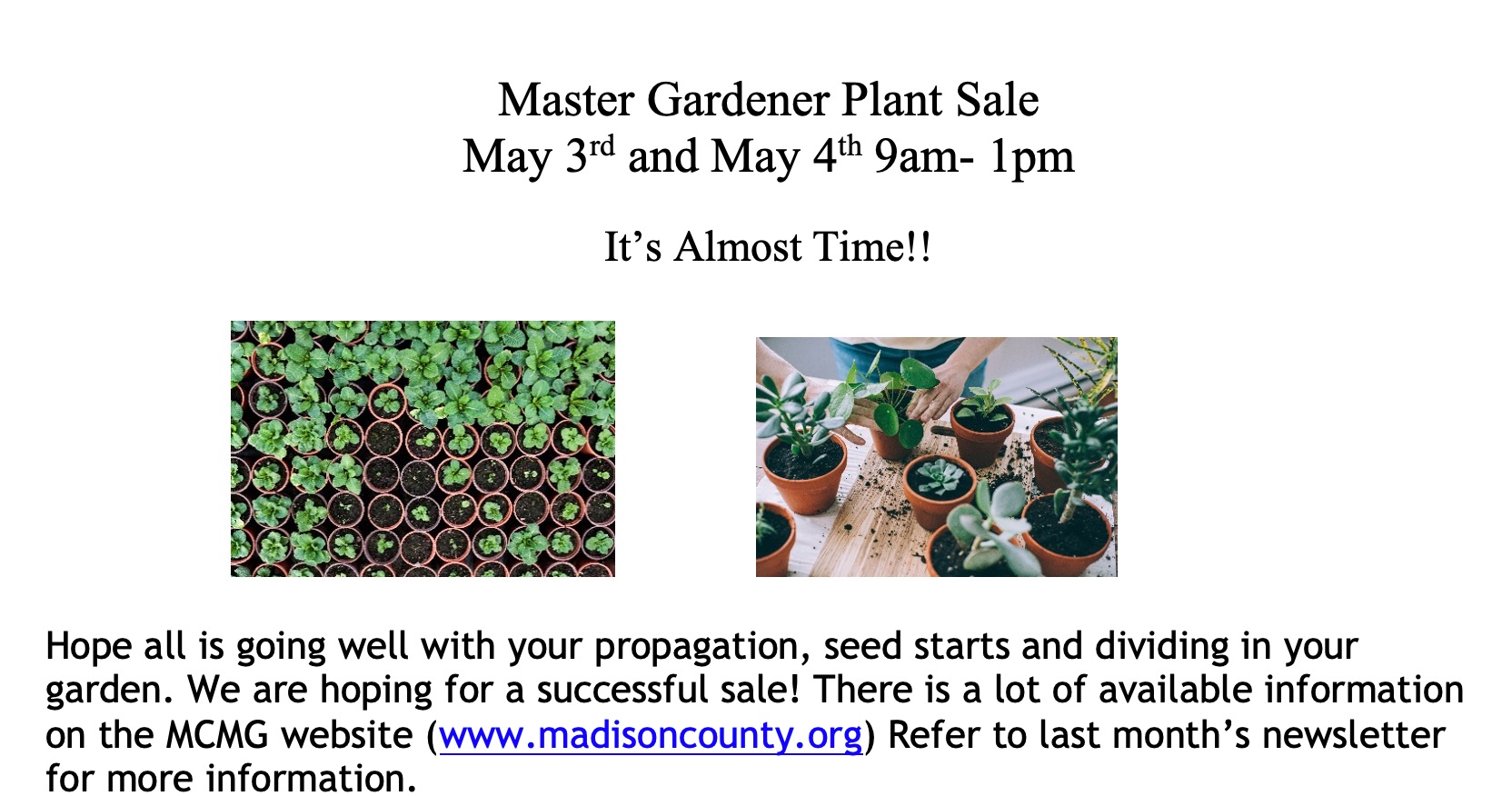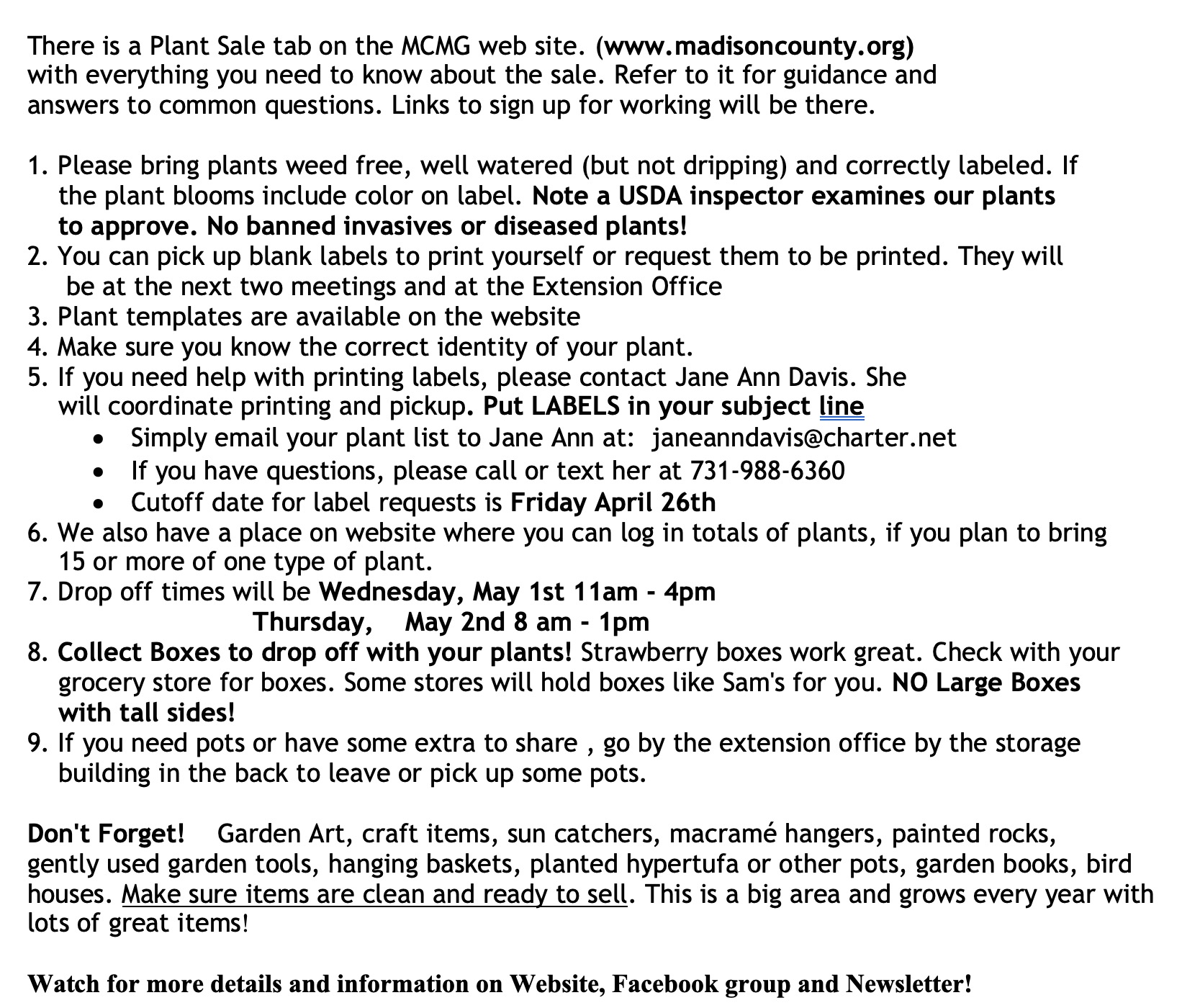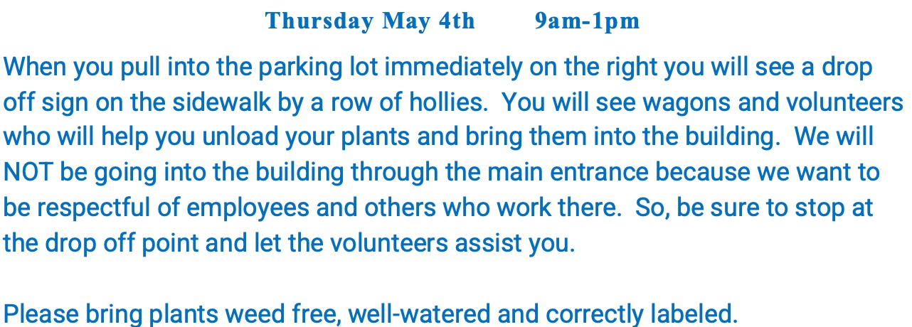 Spring is here!! It won’t be long now until we will be putting annuals in the landscape and planting our vegetable gardens. Be on the lookout for plants from your garden to add to our plant sale. Thanks to David and Carol Sams for generously allowing a “dig day” at their house to provide plants for the sale.