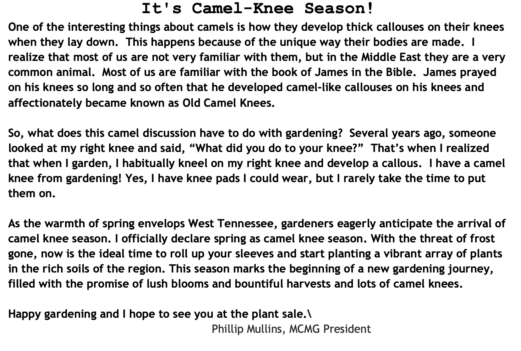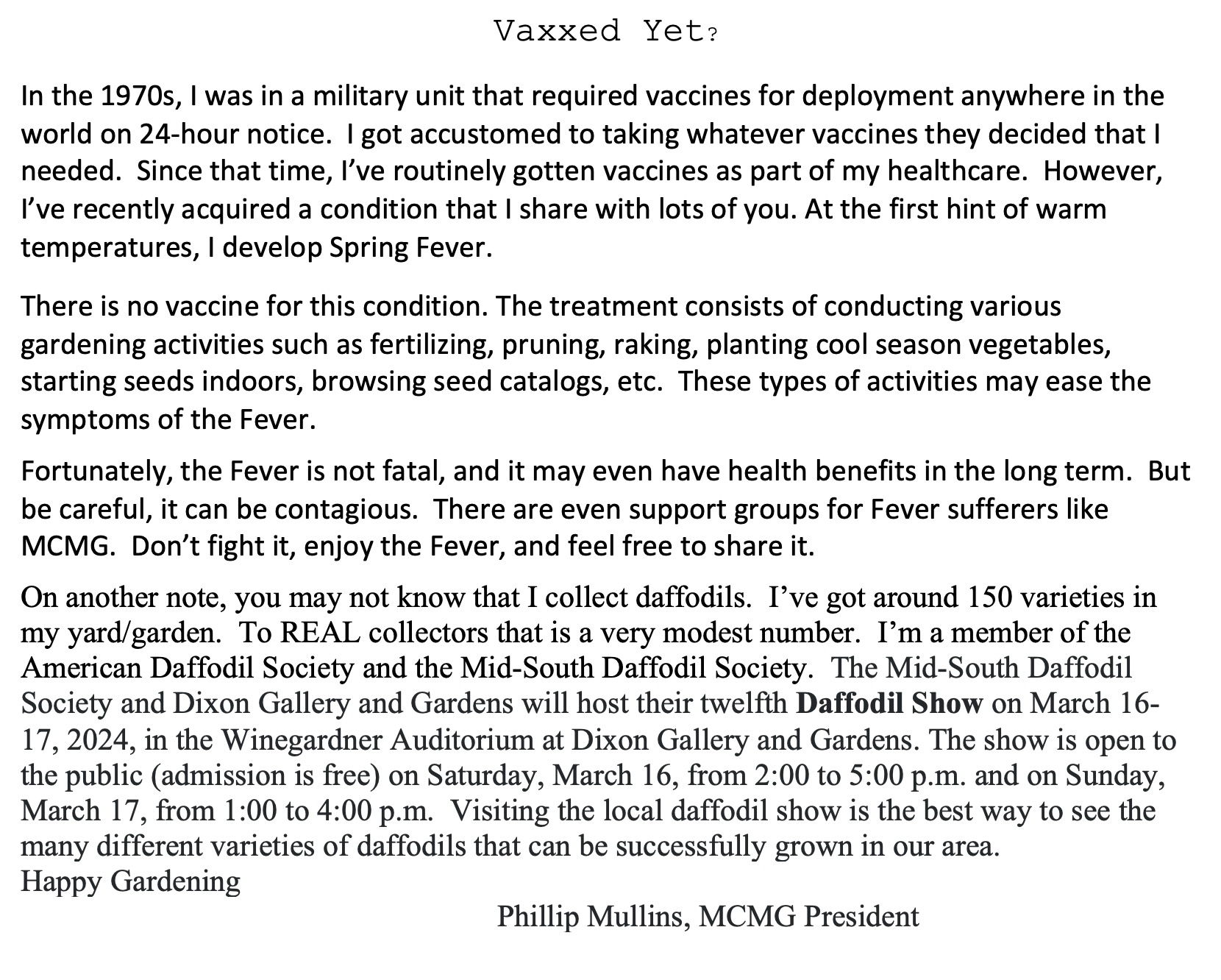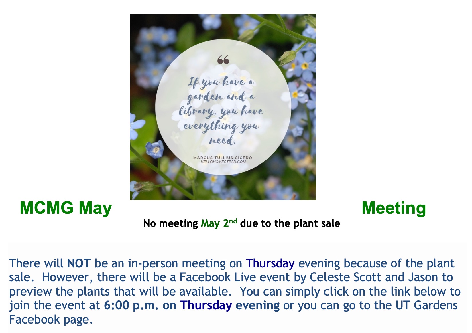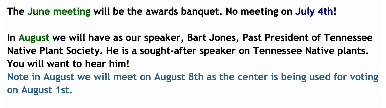 Spring is here!! It won’t be long now until we will be putting annuals in the landscape and planting our vegetable gardens. Be on the lookout for plants from your garden to add to our plant sale. Thanks to David and Carol Sams for generously allowing a “dig day” at their house to provide plants for the sale.