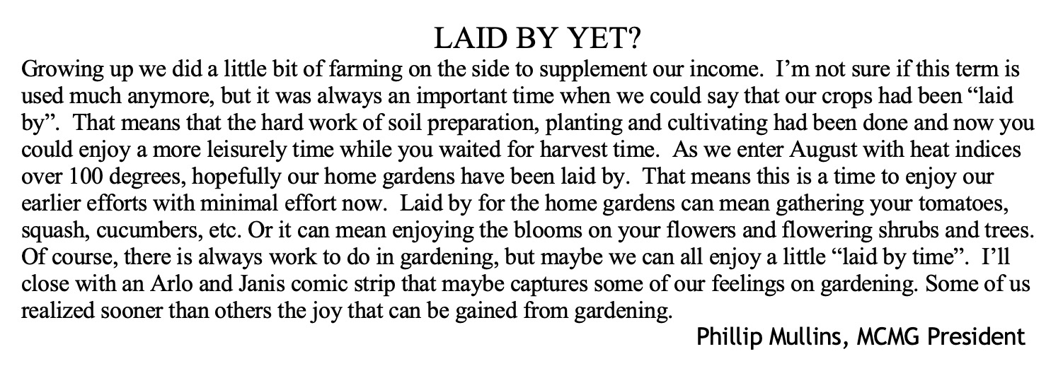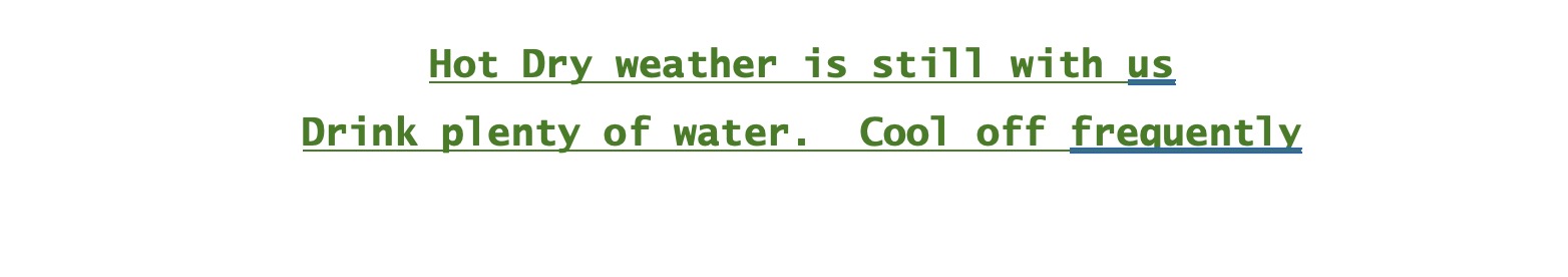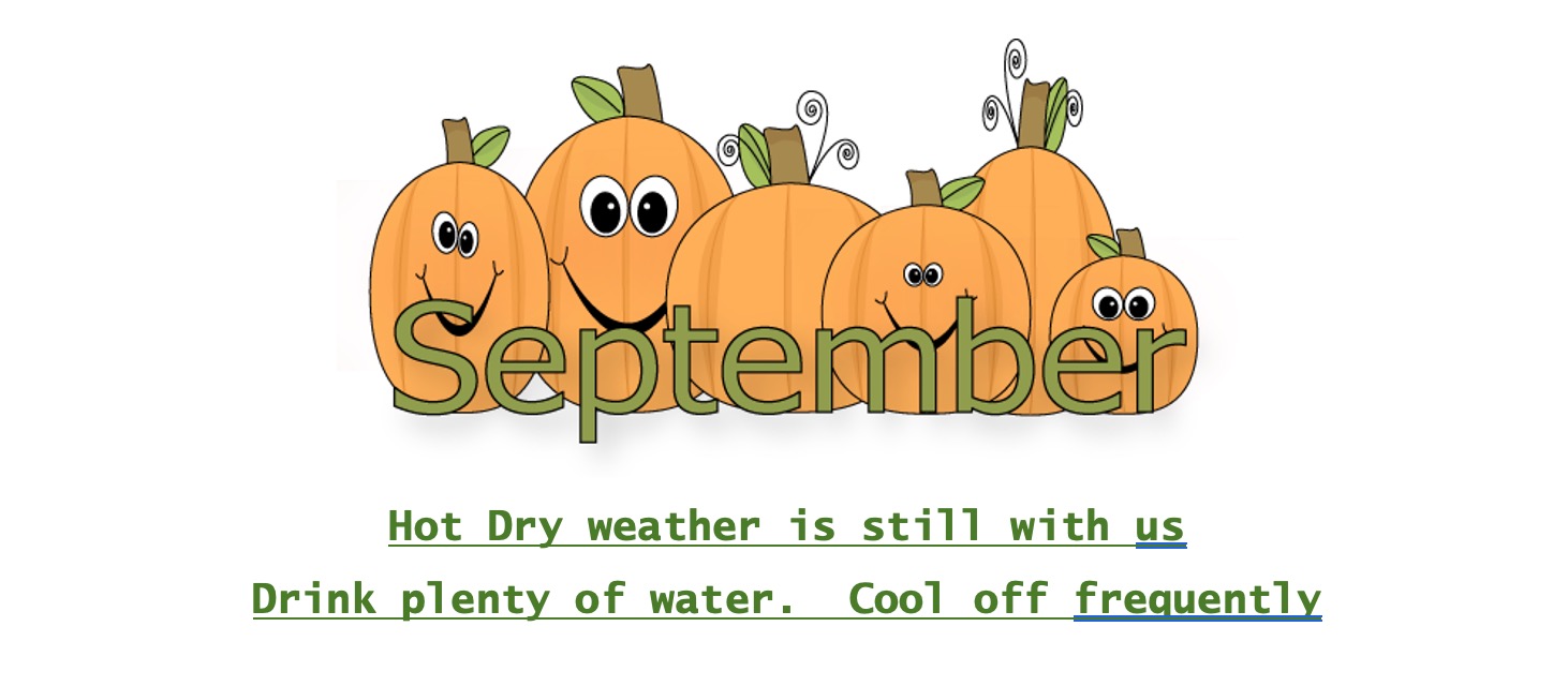 Well, we have made it through the hottest part of summer. Here's hoping September will be abit cooler and bring some much needed rain. I don’t know about all of you, but we haven't had much measurable rain since June. The hoses and sprinklers have been given a workout over the past couple of months.