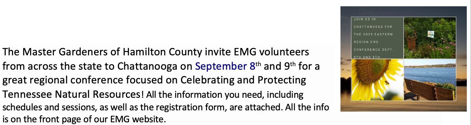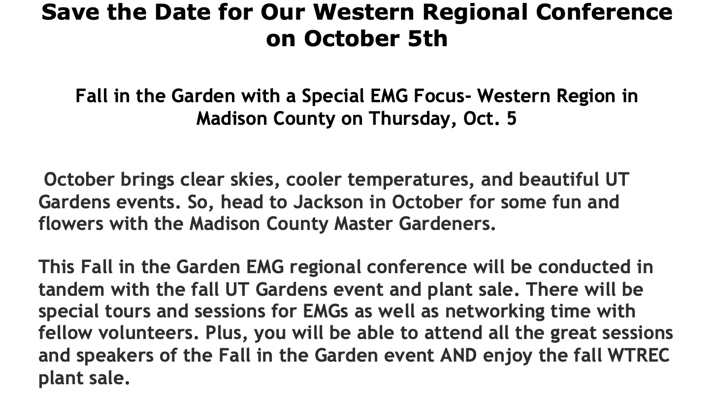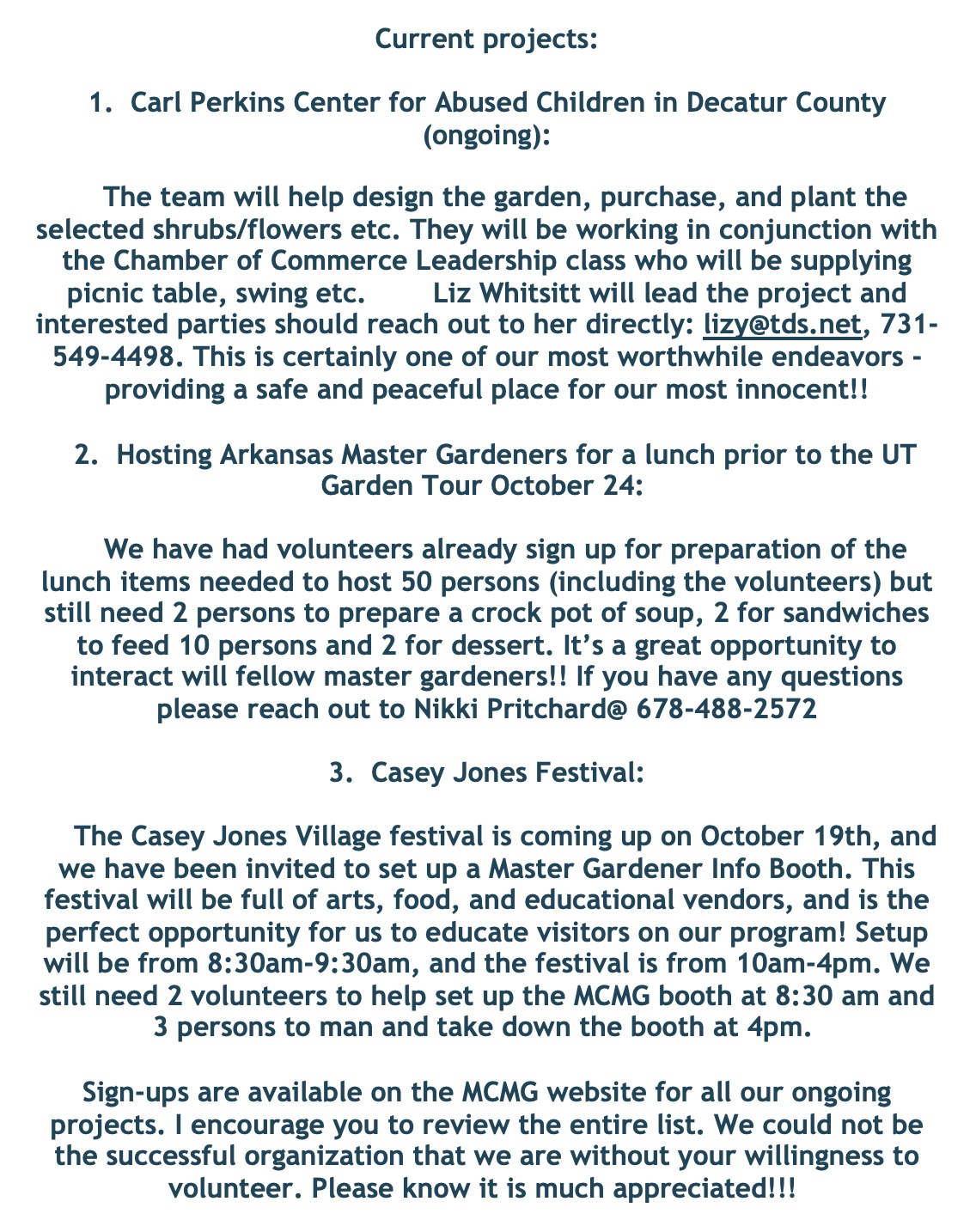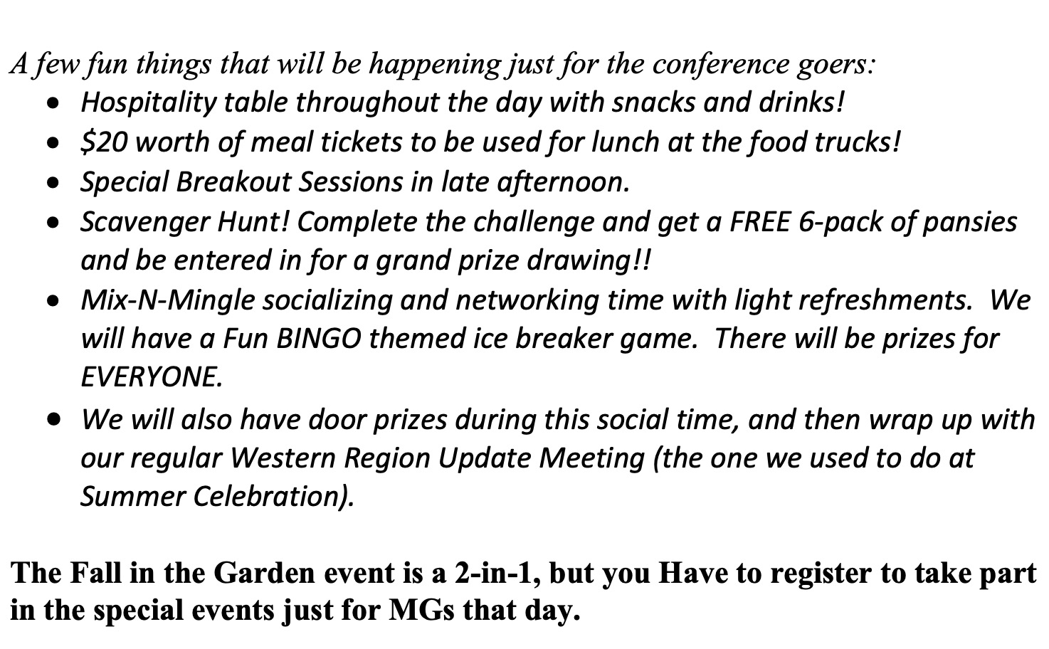 Sign up for the October event, 'Fall into the Gardens, ' on October 2, at the MG info booth, and/or host an activity that people can take home with them. If you don’t have access to the signup form, reach out to Nikki at 678-488-2572.