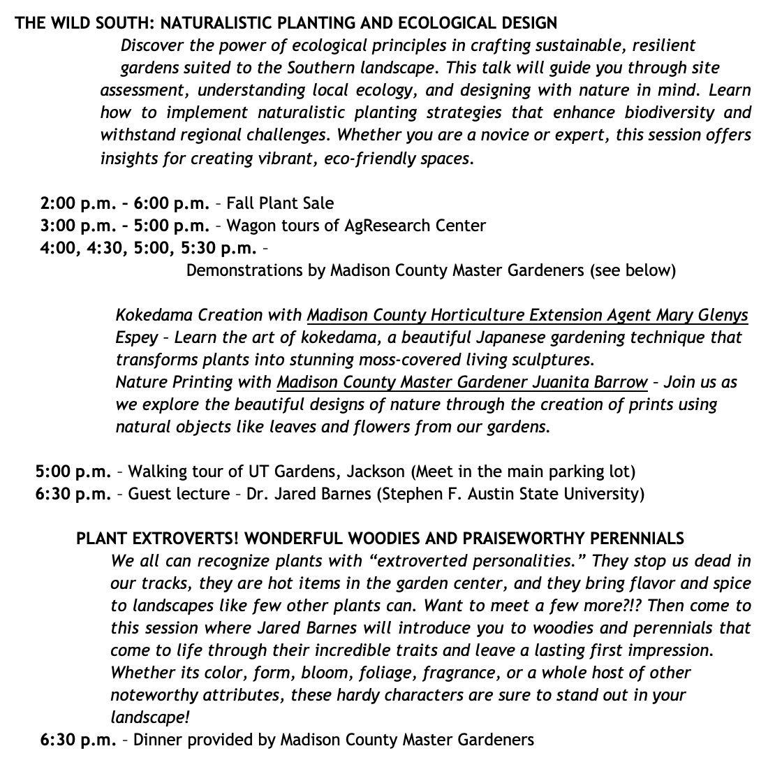 We are excited to reveal the complete program for Fall in the Gardens! This year, you will once again experience all the lectures, tours, demonstrations, vendors, plant sales, and more that you know and love.