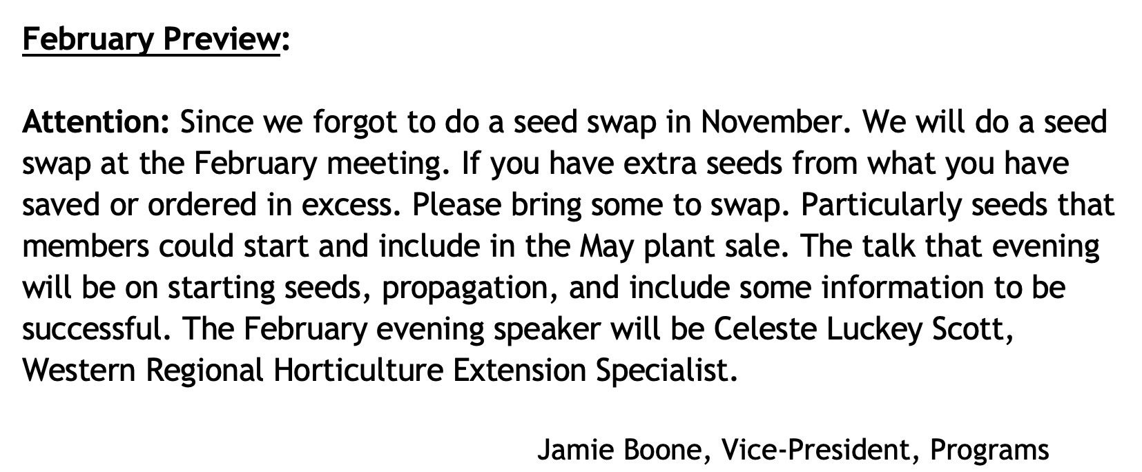 It's October, and this year is flying by. I can't believe it is already fall and time to start preparing for winter. It sure hasn’t felt like it outside. I hope everyone has made plans to attend Fall in the Garden on October 2. Jason willbe having his fall plant sale that day, and many other activities have been planned for afull day of garden fun and education. We are especially excited for our speaker, BrieAuthor, to be joining us for the day. She will be speaking during the day and also at ourevening meeting. The meal that night will be provided, but we are asking you to provide desserts. It's time to prepare our gardens for winter and start thinking about spring. Fall is a great time to plant trees and shrubs, and hopefully, we won't have to worry so much about watering them as often as we do in the summer months. This is also the time to gather seed from some of the annuals and perennial flowers you may want to plant next summer or prepare for the spring plant sale. There will be a seed exchange at our November meeting. How exciting to possibly get something new for your spring garden.