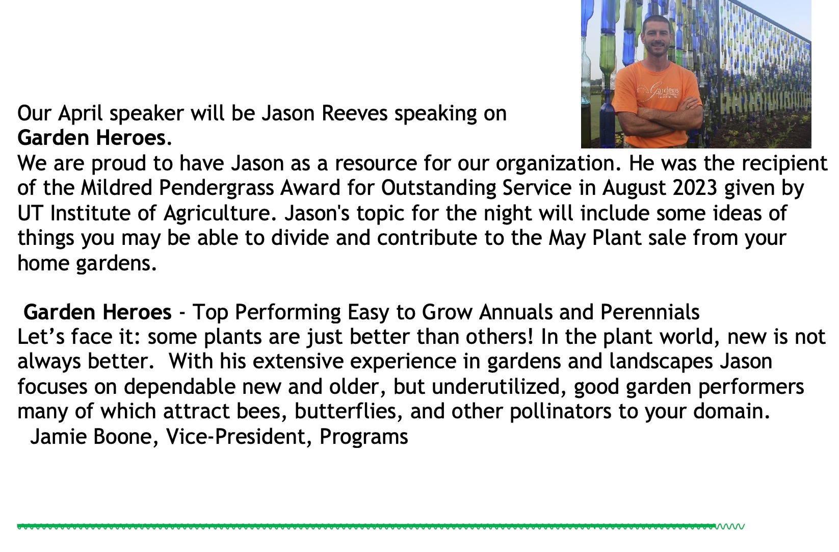 Let’s face it, some plants are just better than others! With his extensive experience in gardens and landscapes, Jason has identified proven performers. In the plant world, new is not always better. This talk will have you racing to our plant sale to try out these champions of the garden that include old standbys and newer established players. These annuals, perennials, shrubs, and trees are sure to please.