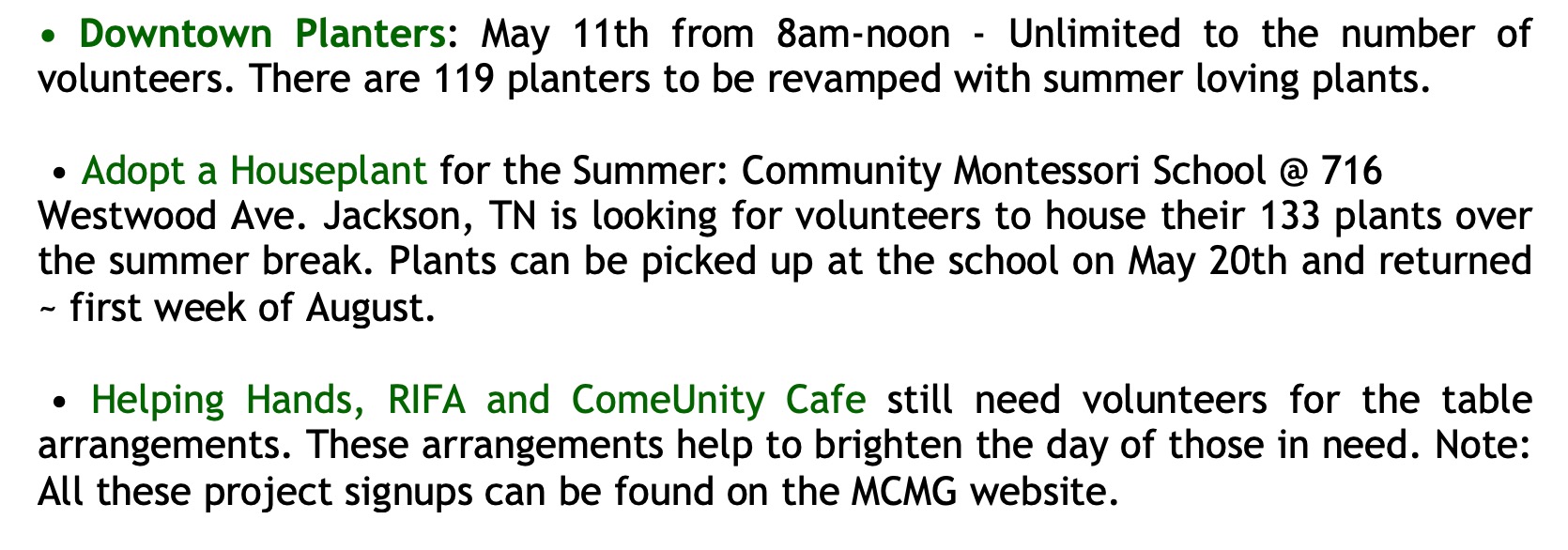 The Casey Jones Village Festival is scheduled for October 18, and we are still seeking two individuals to staff the MCMG information booth from 11 am to 2 pm. Signup is available.