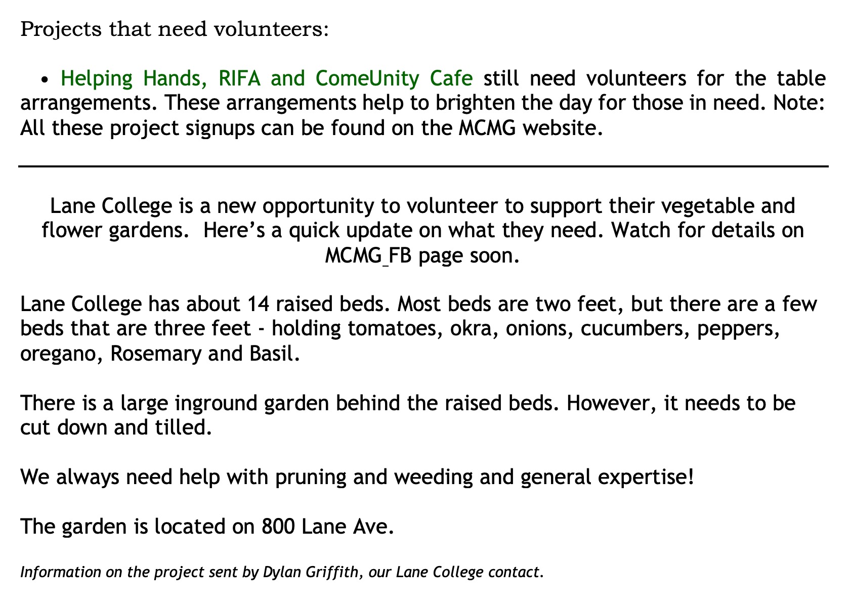 Sign-ups are available through the Madison County Master Gardener website for upcoming projects, so check back often to see where you would like to help.