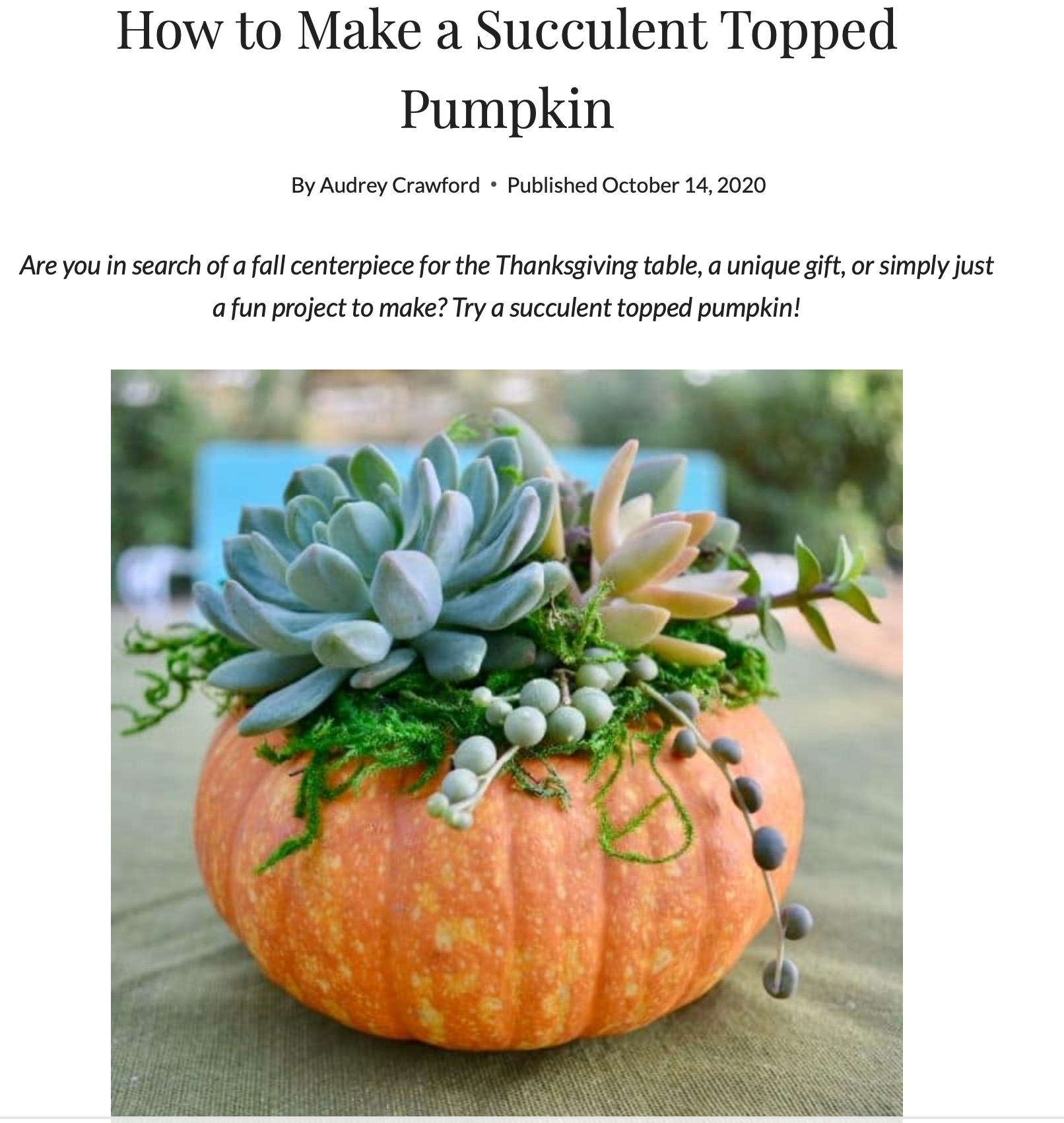 This beautiful craft looks so easy to do. This was completed by Audrey Crawford of Audrey's Little Farm. She has instructions on her website (https://audreyslittlefarm.com/succulent-pumpkin/?ck_subscriber_id=3376034716&utm_source=convertkit&utm_medium=email&utm_campaign=All+About+Pumpkins+%F0%9F%8E%83+-+19172807). This would be a lovely centerpiece or gift for a friend. It can also be sized up or down. This would be good way to use some of those extra indoor houseplants that you've gotten tired of.