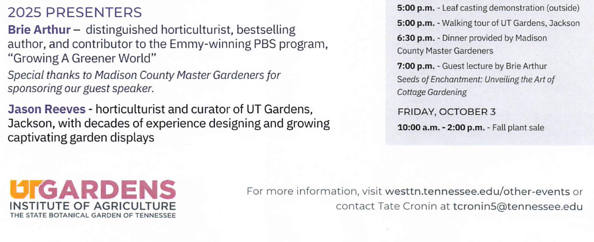 • Finally, we are excited to reveal Brie Arthur's talk titles! Join us at 12:30 p.m. for "Foodscape Fusion: Pioneering A New Garden Era" to learn about landscape design that maximizes color, texture, flavor, and creativity. She speaks again at 7 p.m. on "Seeds of Enchantment: Unveiling the Art of Cottage Gardening," discussing the best tips and tricks for growing plants from seed. Thank you to Madison County Master Gardeners for sponsoring our guest speaker!