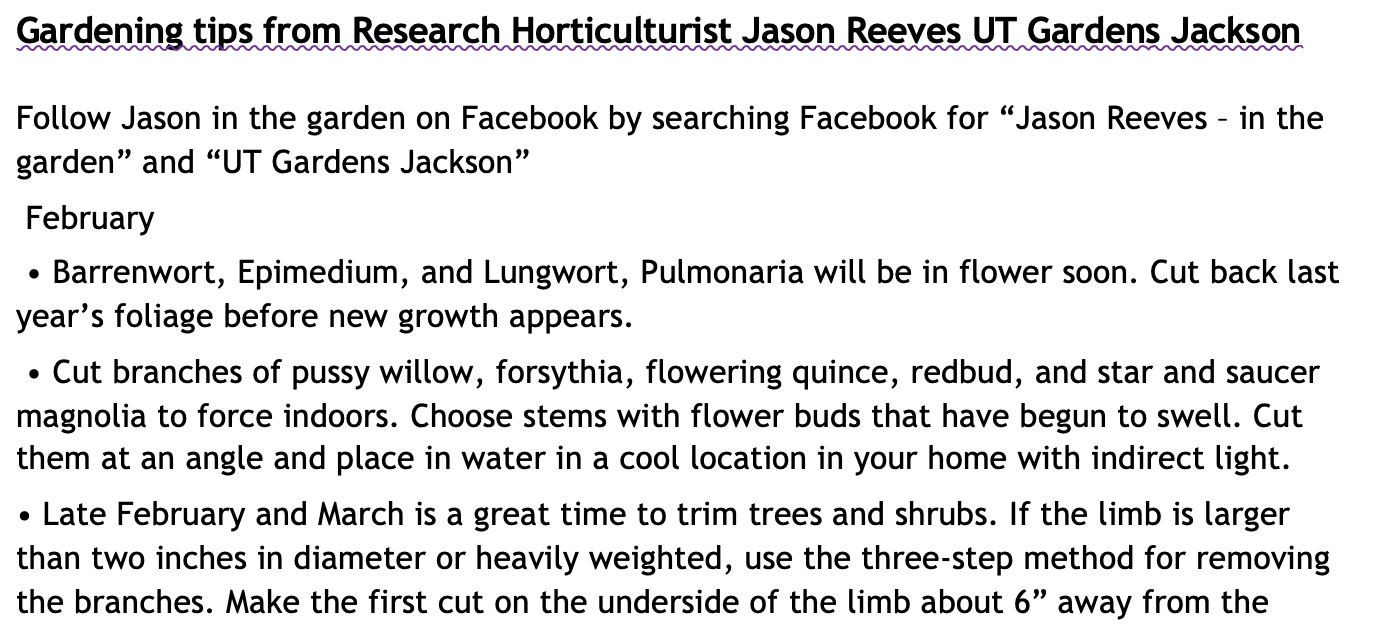 Direct sow annuals and vegetables after danger of frost this month. Jackson's average frost date is around April 15. Look at the 10-day forecast. There could be cold weather predicted. We had an early May frost last year.