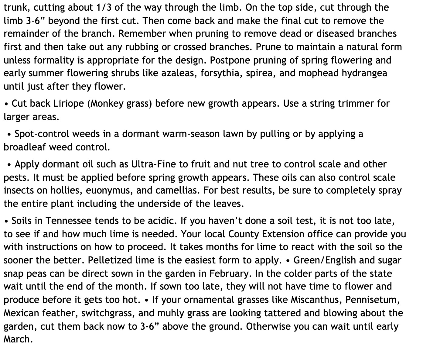 Prune early blooming shrubs such as azaleas, forsythias, flowering quince and loropetalum AFTER they bloom. Selectively cut old or unruly branches by reaching as deep as you can into the shrub.